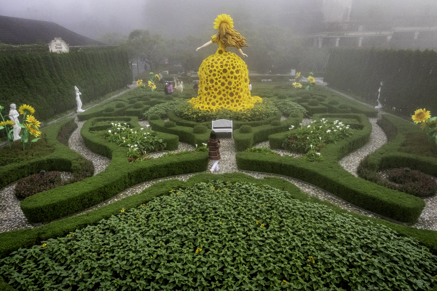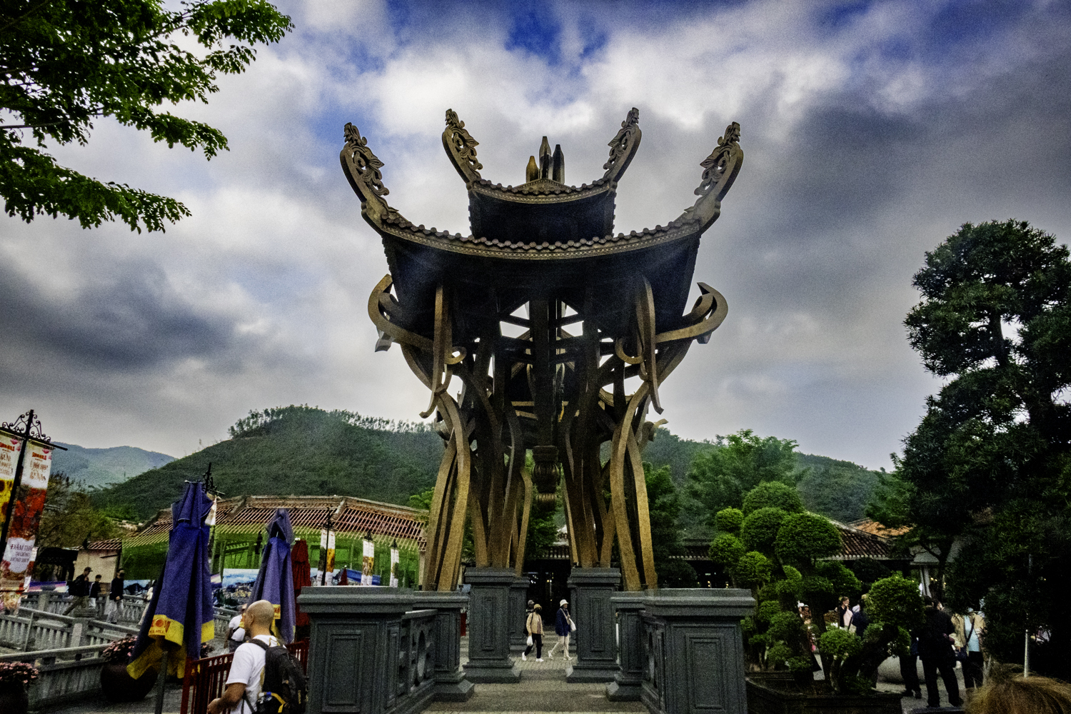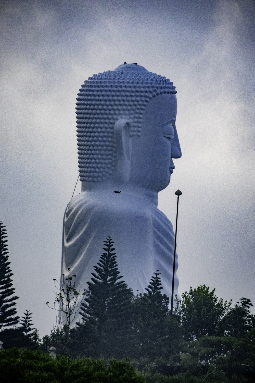 We spend most of an hour on the bridge and our cameras finally relinquish control to us. But we have been teased again! Off in the fog, we have spotted a tall Budda statue and we are off in search of more camera entertainment. Another mile of path brings us to the Budda statue after trekking through displays and the Heavenly Garden that would make Walt Disney proud! Everything is a bit surreal in the fog!