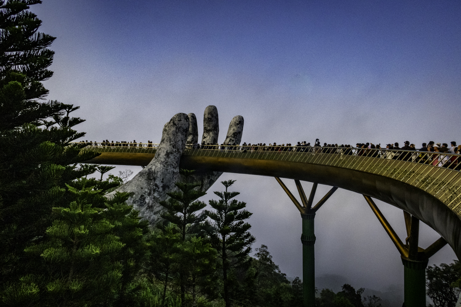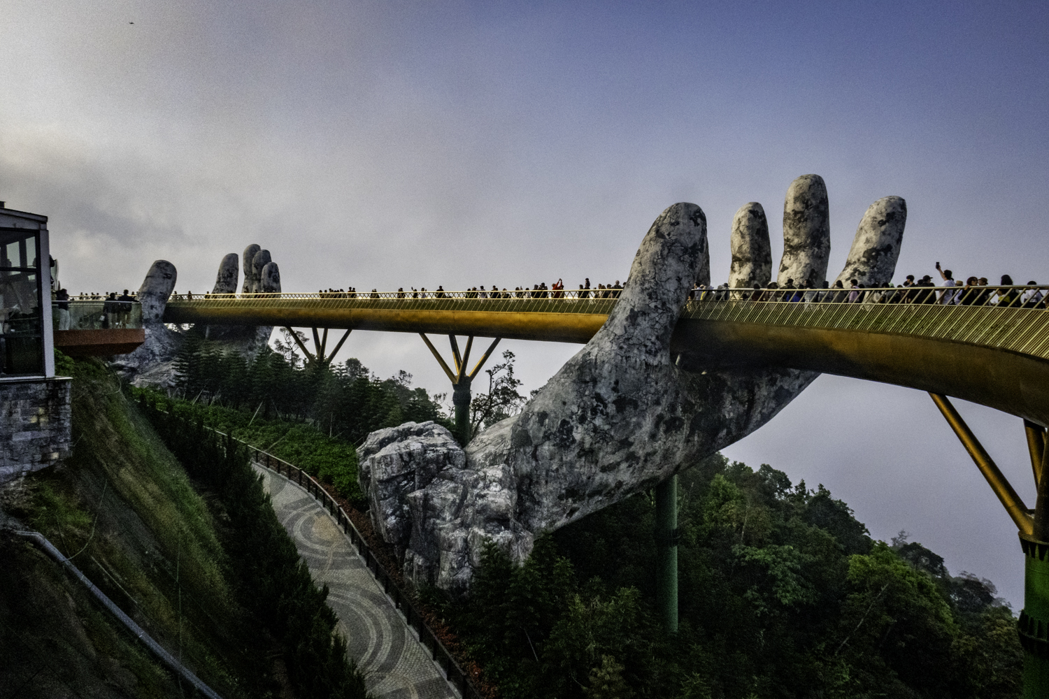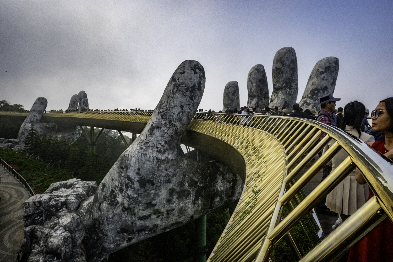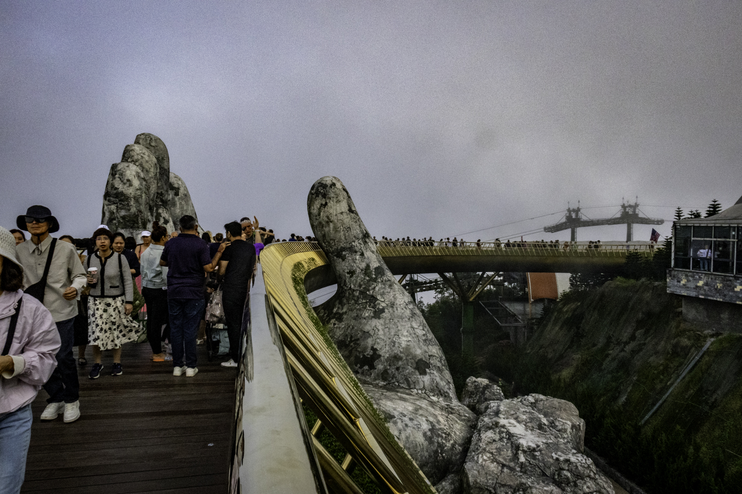 We navigate throngs of people and shortly arrive at the main attraction, the Golden Hand Bridge! This is a marvel of engineering at its finest! Our cameras are feeling like royalty! This bridge connects Marseille Station and the Heavenly Garden and is 150 meters long.
