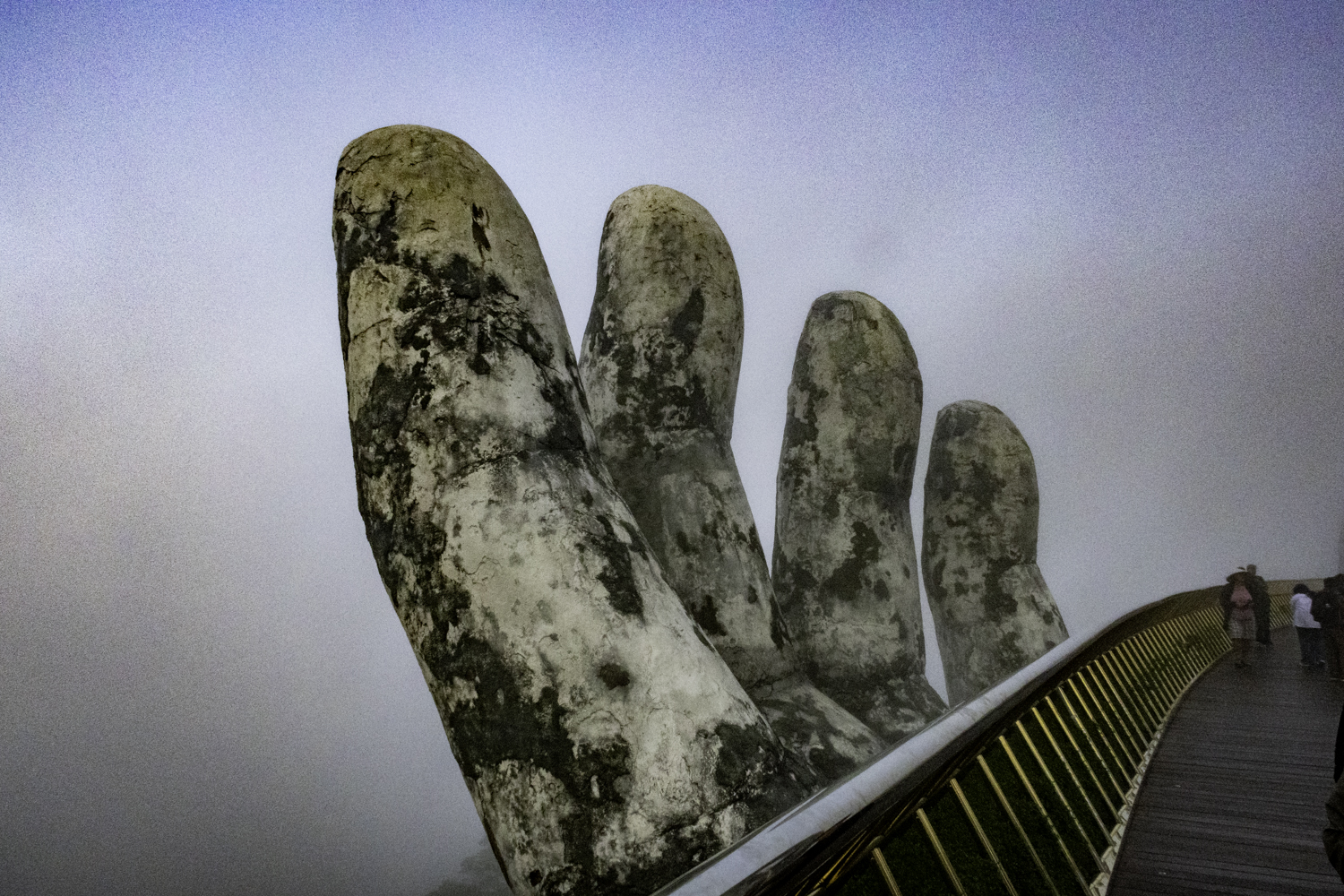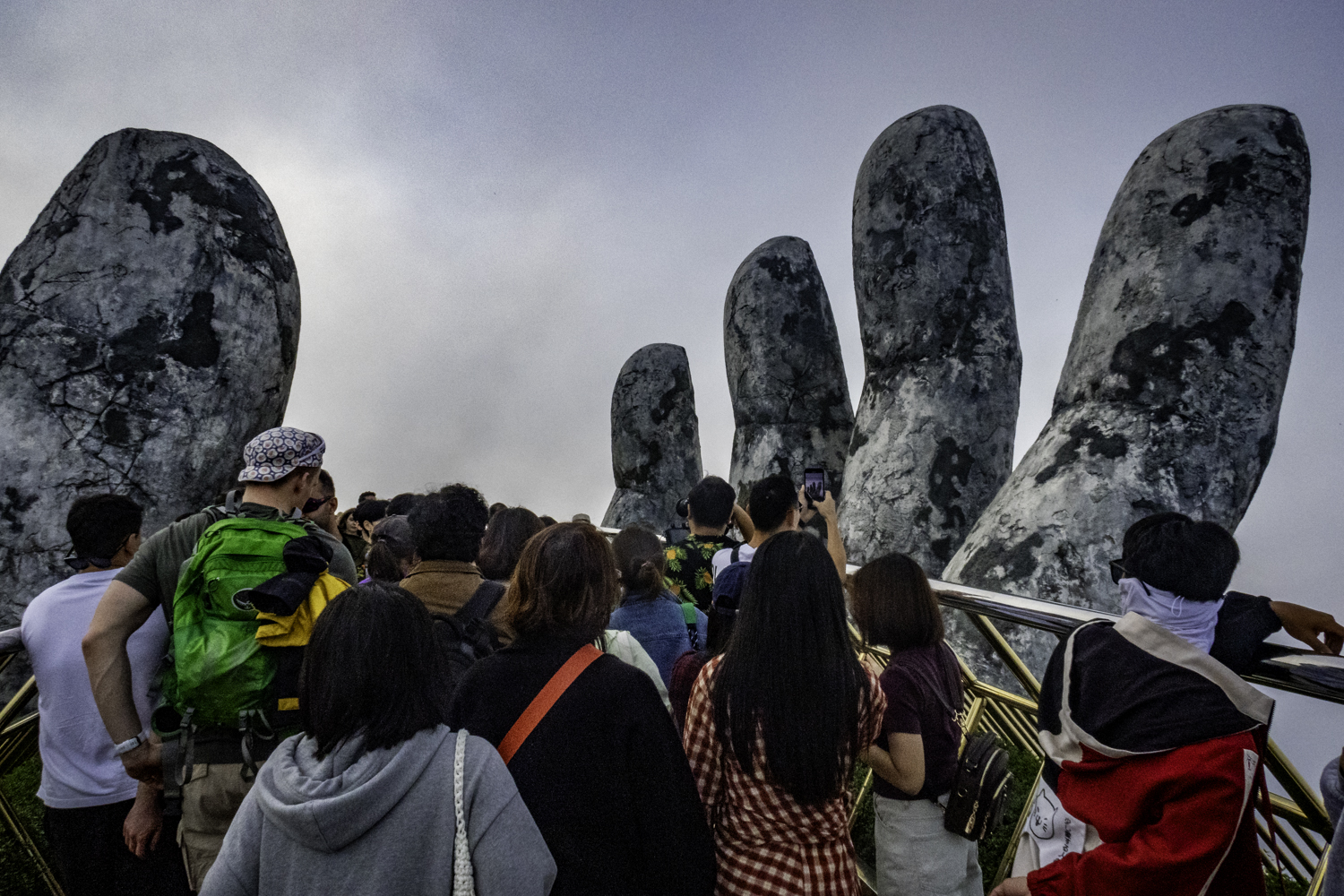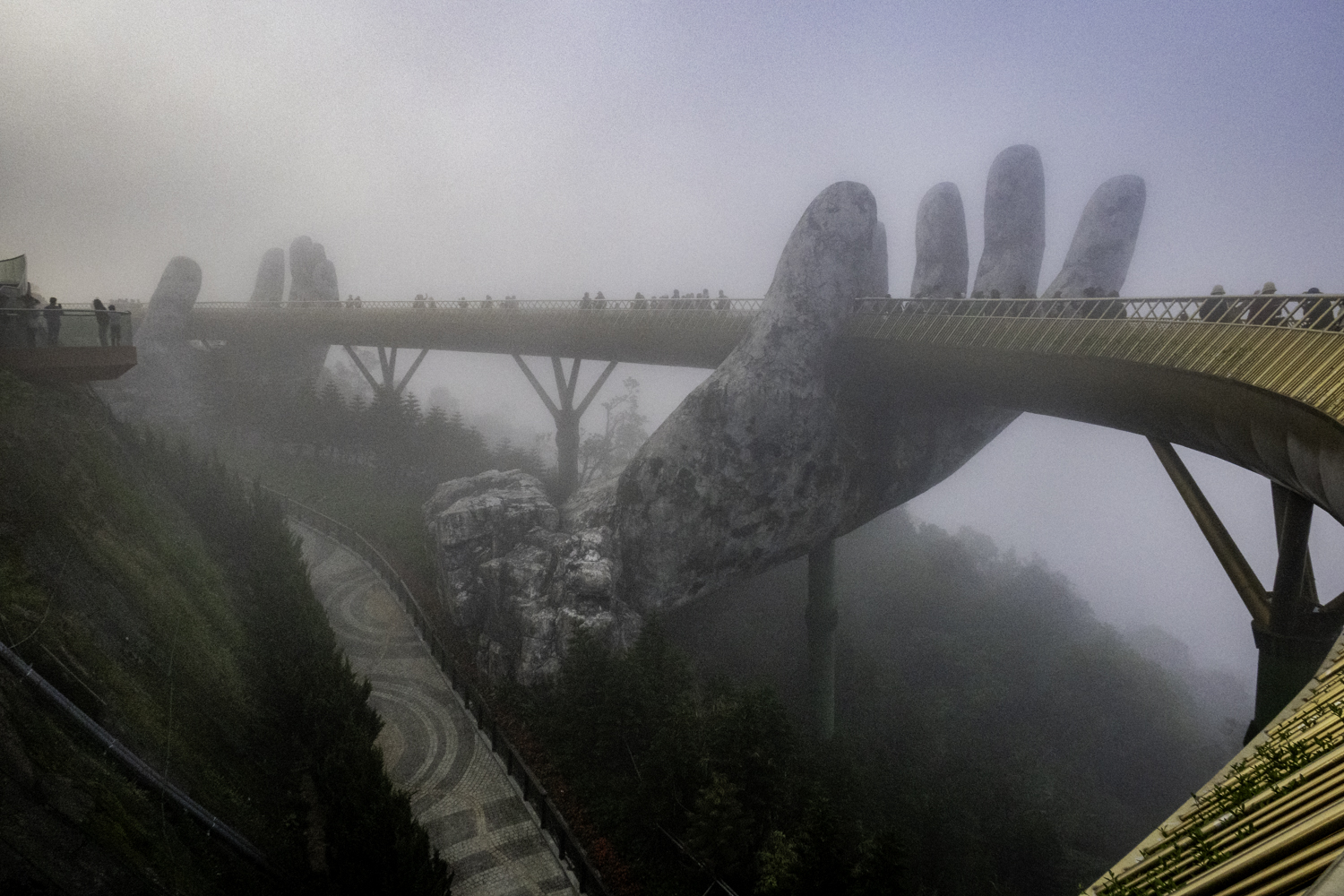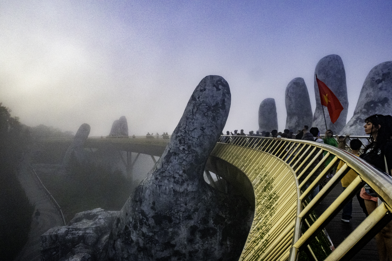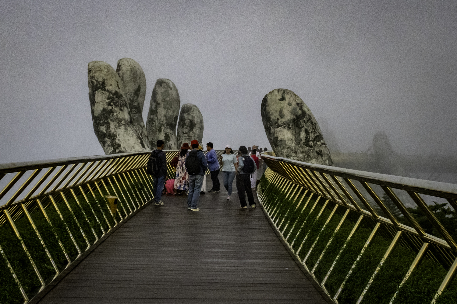 We navigate throngs of people and shortly arrive at the main attraction, the Golden Hand Bridge! This is a marvel of engineering at its finest! Our cameras are feeling like royalty! This bridge connects Marseille Station and the Heavenly Garden and is 150 meters long.