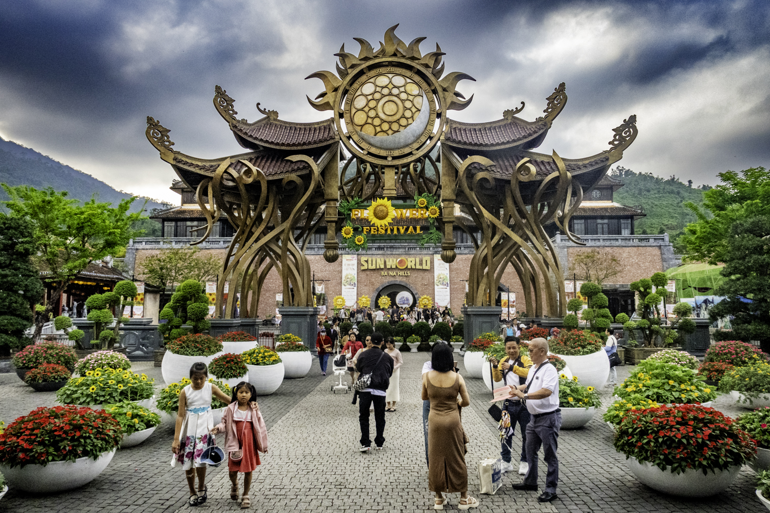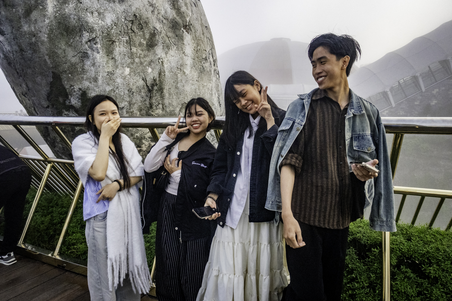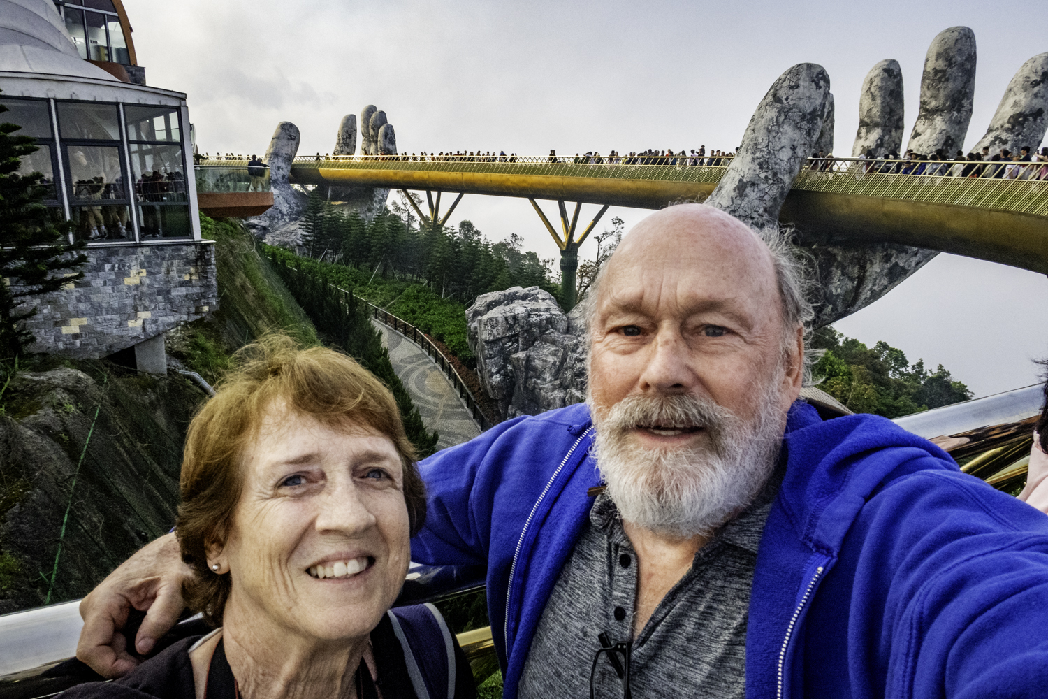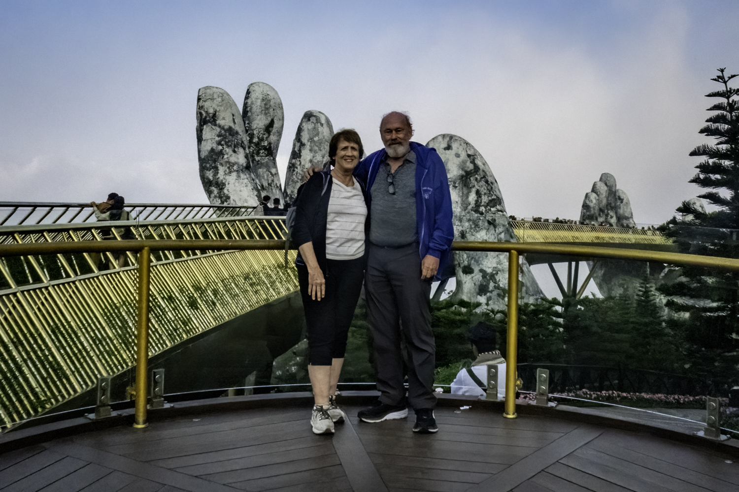 We navigate throngs of people and shortly arrive at the main attraction, the Golden Hand Bridge! This is a marvel of engineering at its finest! Our cameras are feeling like royalty! This bridge connects Marseille Station and the Heavenly Garden and is 150 meters long.
