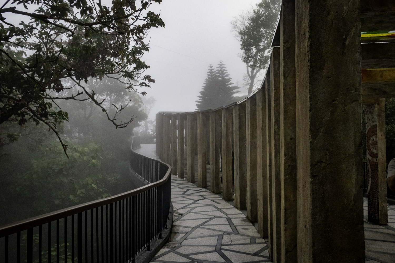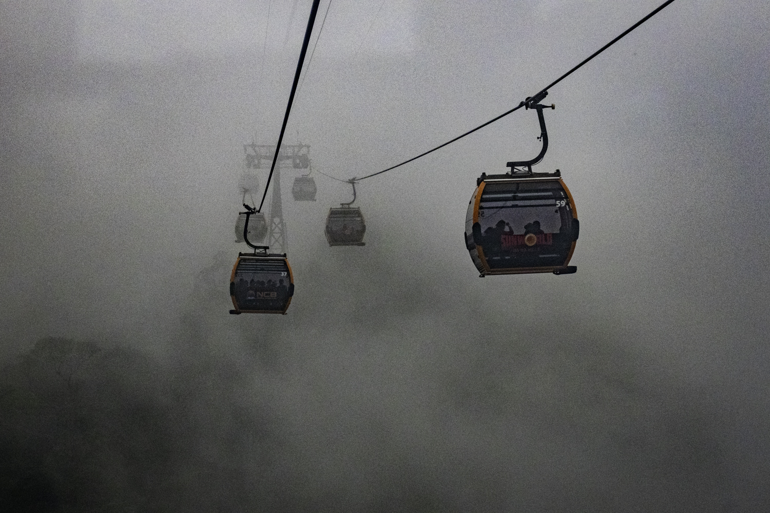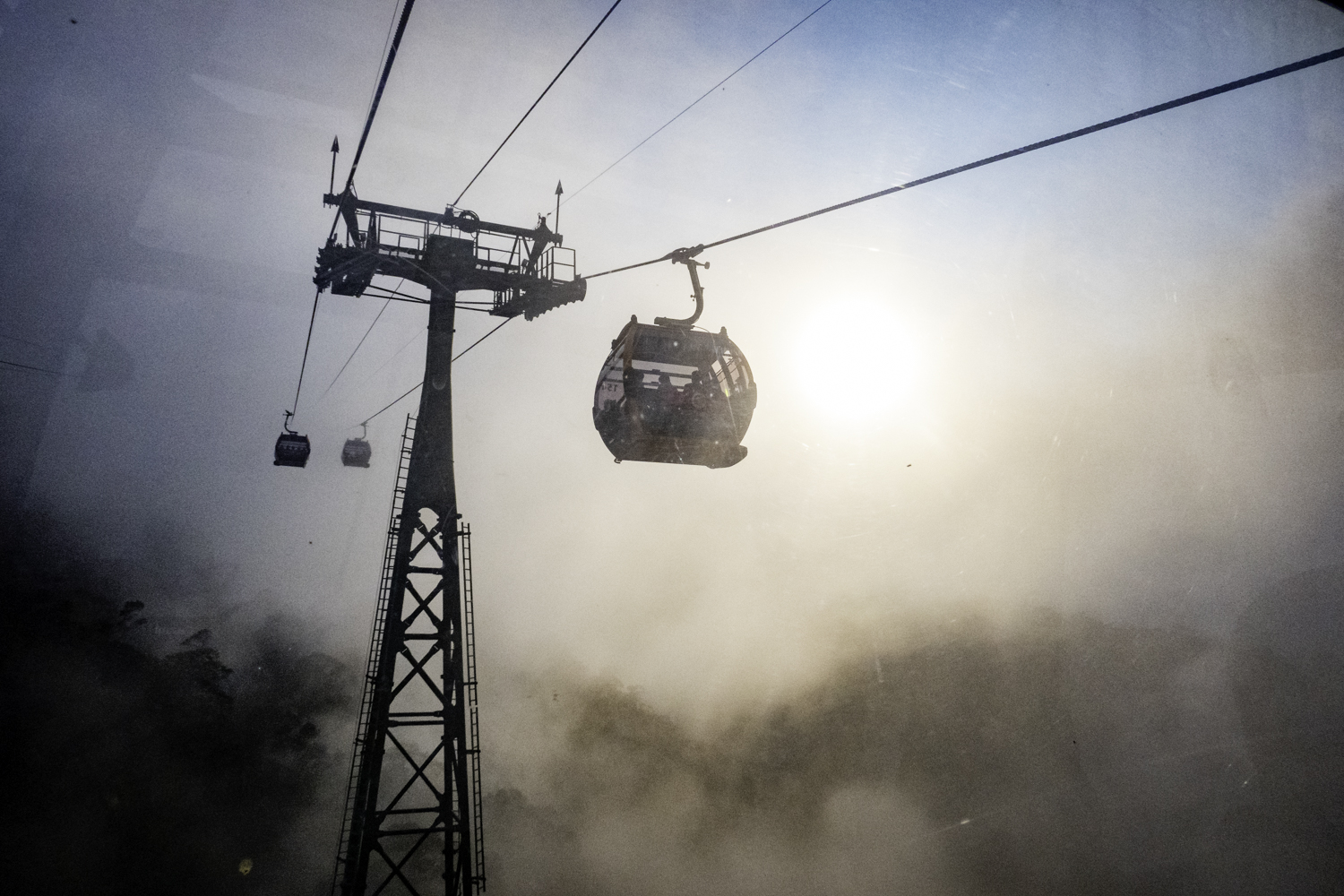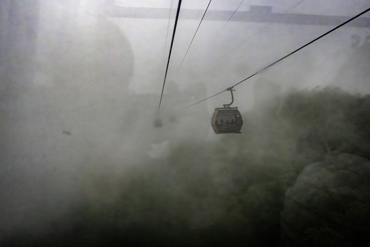 We eventually come to a cable car system. We board the cable car with 8 people (our group and guide). As we go up the mountain, we realize that there is a car every 100 feet or so. Then we look around and see there’s at least 6 cable car systems going up this mountain! There are cable cars as far as the eye can see! We move rapidly up through fog and mist. We disembark at the top after a 20 minute ride (and the car moved fast!). We are now at 1414 meters (approximately 4639 feet) above sea level.