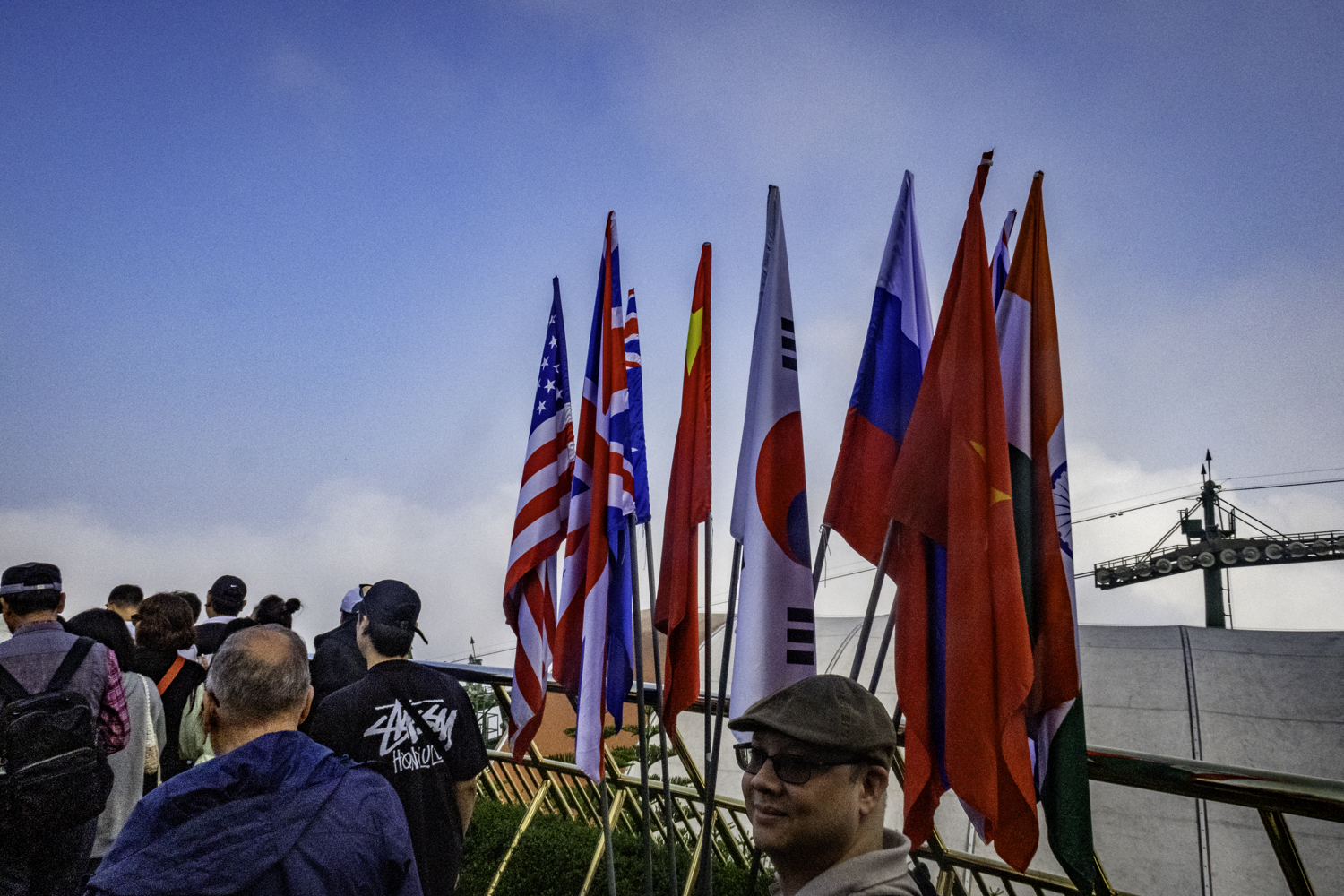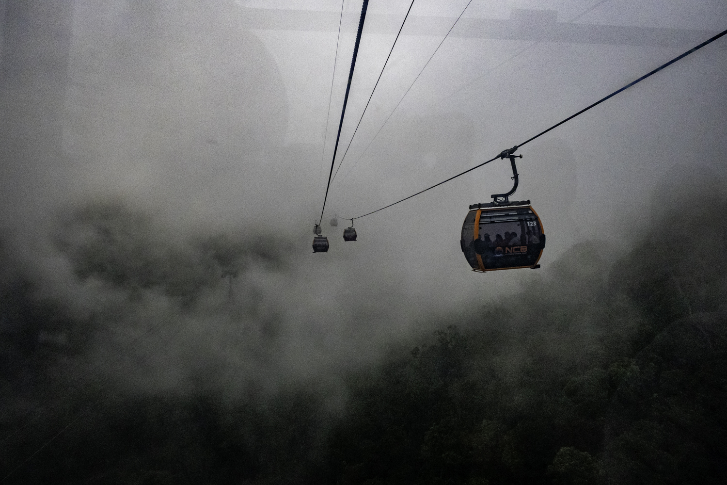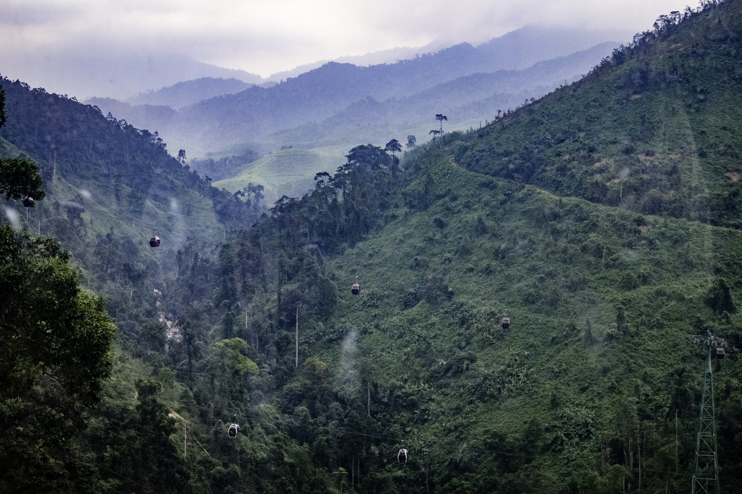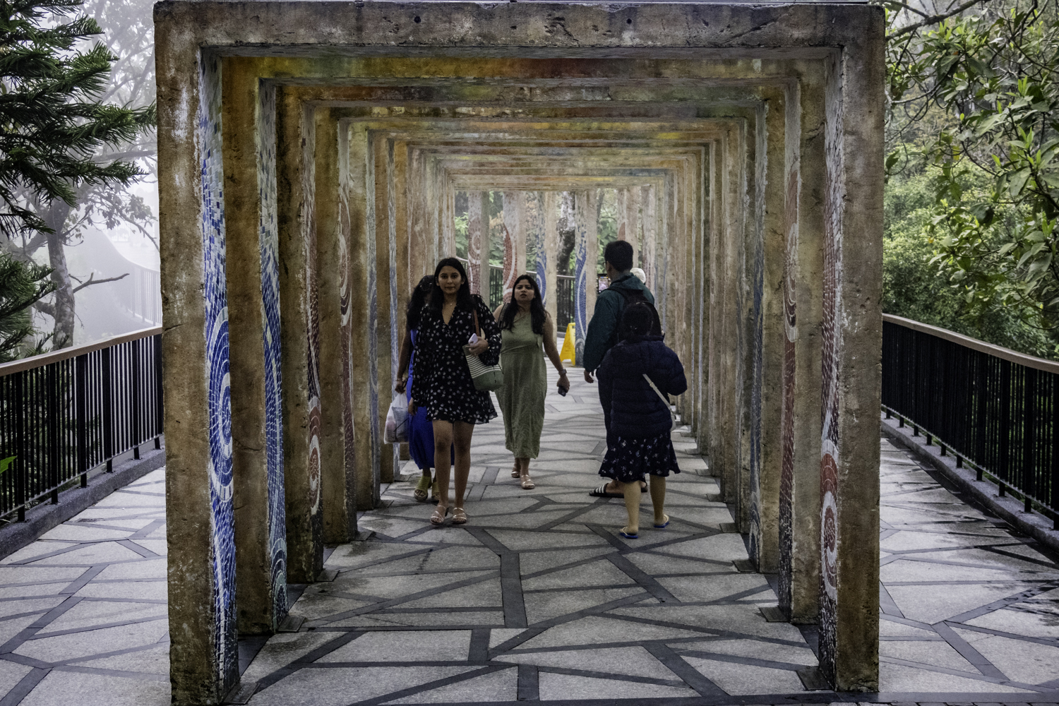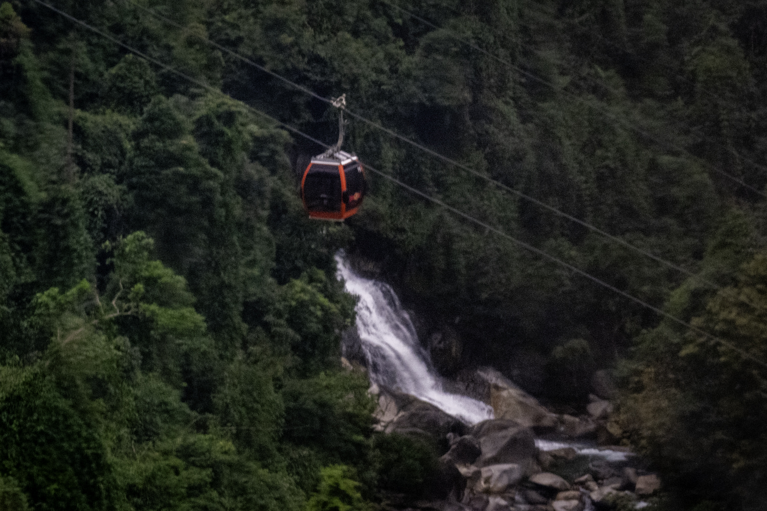 We eventually come to a cable car system. We board the cable car with 8 people (our group and guide). As we go up the mountain, we realize that there is a car every 100 feet or so. Then we look around and see there’s at least 6 cable car systems going up this mountain! There are cable cars as far as the eye can see! We move rapidly up through fog and mist. We disembark at the top after a 20 minute ride (and the car moved fast!). We are now at 1414 meters (approximately 4639 feet) above sea level.