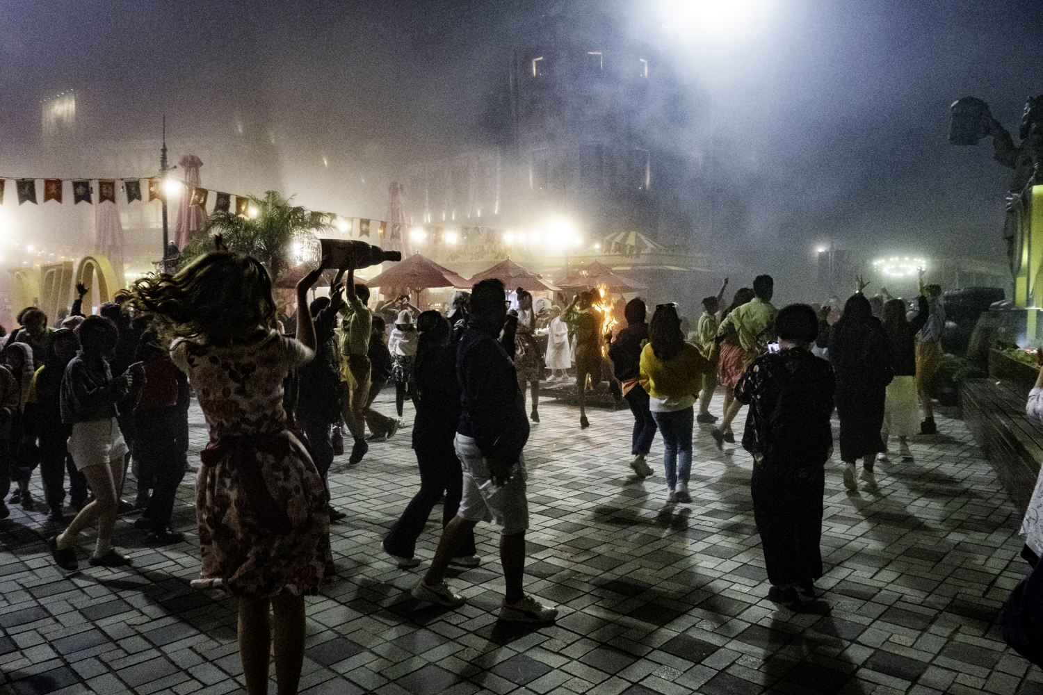 I never order a second beer. We leave and are glad to be out of the din. We pass through revelers partying around a bonfire! We make our way to the correct cable car to go down the mountain. After about 10 minutes, we board the ride down. The fog has set in and it is quite dark, being after 8 PM. The cable car appears to fly off into a white wall and starts to descend. It is very eerie and we all make jokes about the Twilight Zone. 20 or so minutes later, we arrive at the bottom. Or at least the building at the bottom. Then we start descending the escalators, all 8 of them.
