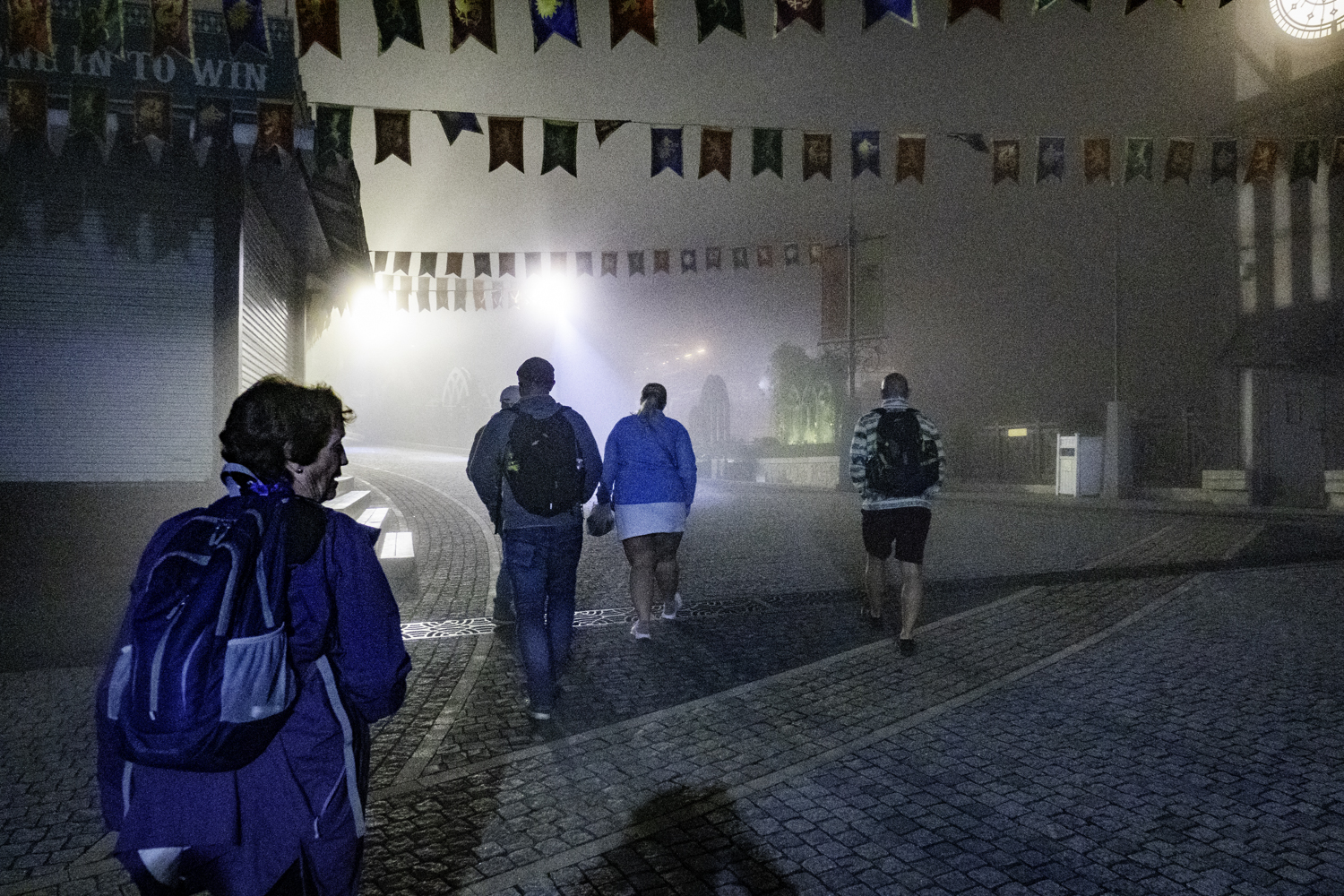 Our cameras satiated, we make our way back to the Bridge and decide to walk across it one more time. We meet up with Hwan, our guide, and head out, thinking we are going down. We board a different cable car and, in the fog, go to a different mountain top. Here we discover a medieval town, replete will castles and turrets galore!