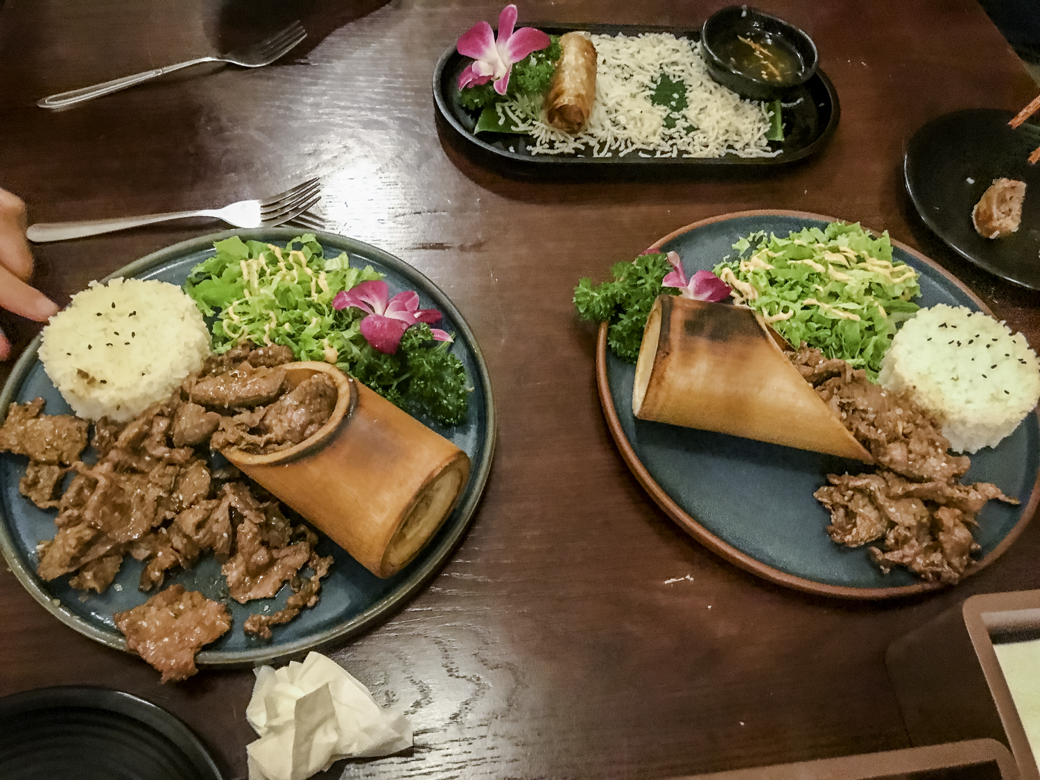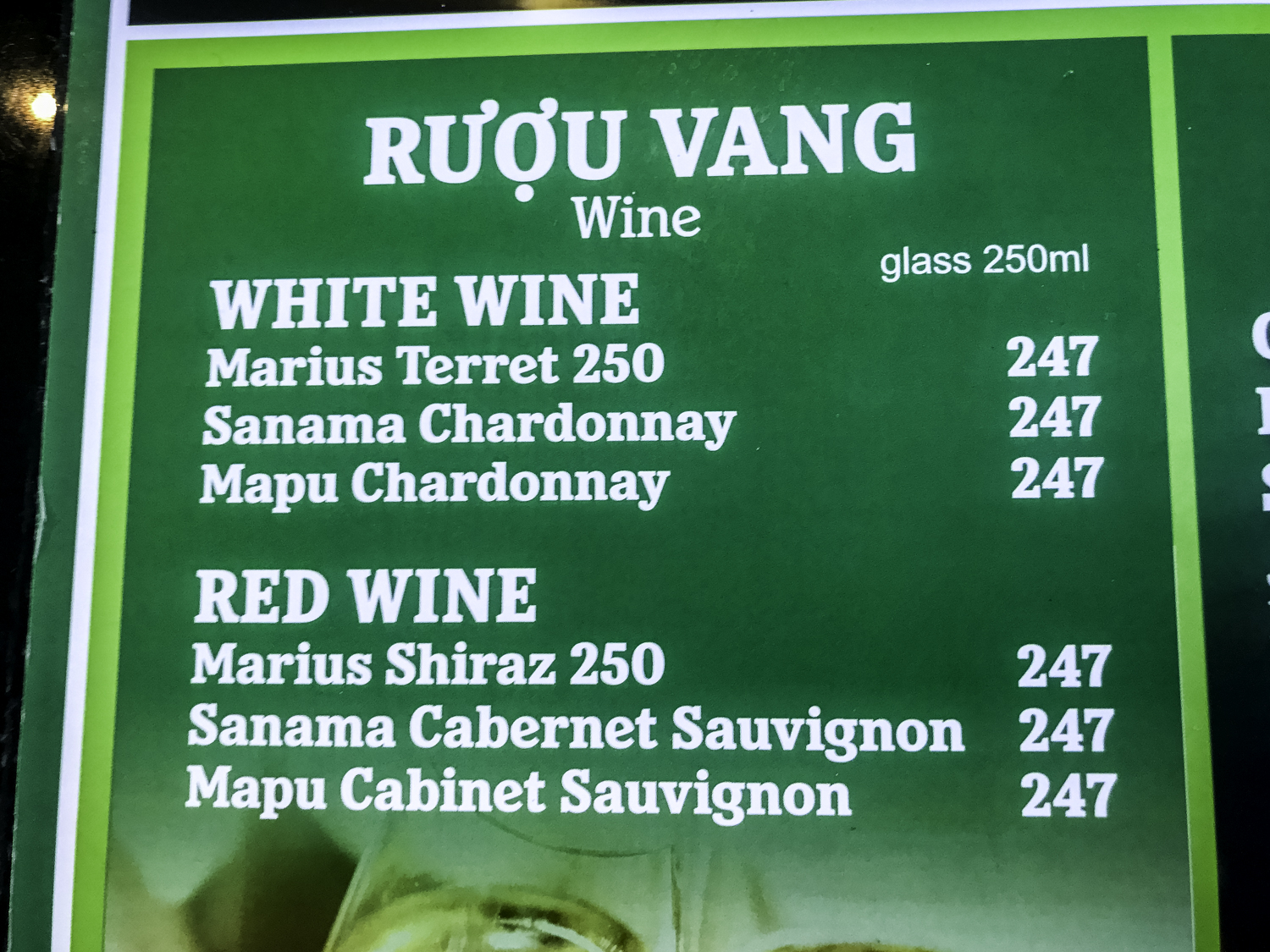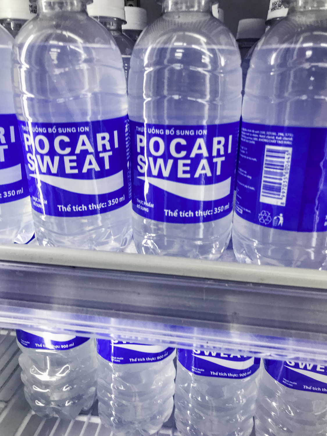 So we stay in touch and 6 of us go to dinner at De Tham restaurant, only 2 blocks away. My meat is cooked in a Bamboo container! Dinner is fabulous and Jon buys for all of us. Thanks Jon! I also spy a display of bottled water. The name is quite interesting! Makes one not want to drink it!