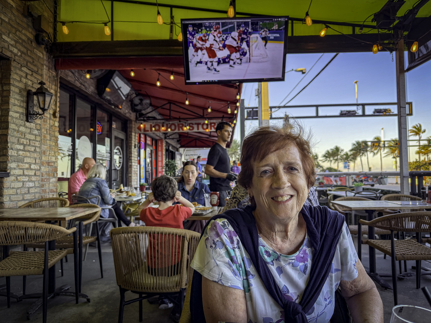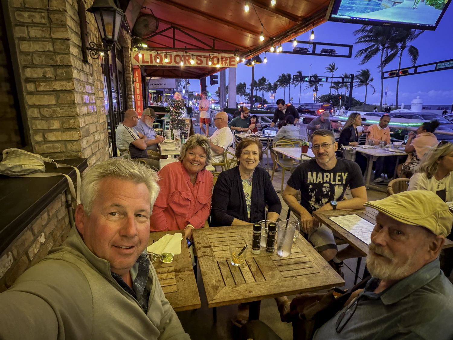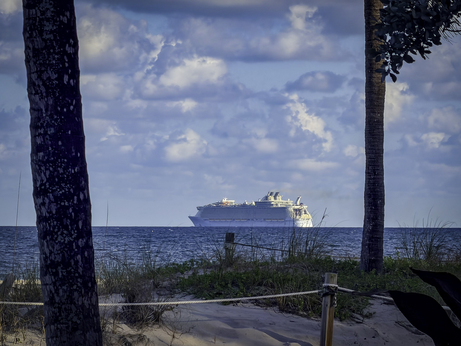 We arrive tired at 9:00 AM in Fort Lauderdale. We hail a cab and get to our hotel around 10:00 AM. After putting our luggage in the hotel, we take a walk around the neighborhood of North Fort Lauderdale. We are only 2 blocks to the beach. We have at least 4 plus hours to kill before we can check in to the hotel. We find a breakfast sandwich food truck that isn’t serving lunch yet so we have a glass of wine. Because why not? We go back to the hotel and they let us check in early. We take a much needed 3 hour nap. We are now in Day 2. We walk to the beach 2 blocks away. I see a ship on the horizon and I get a shot, framing it between 2 trees. Turns out it is our ship!