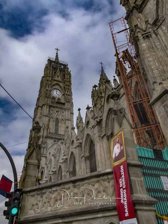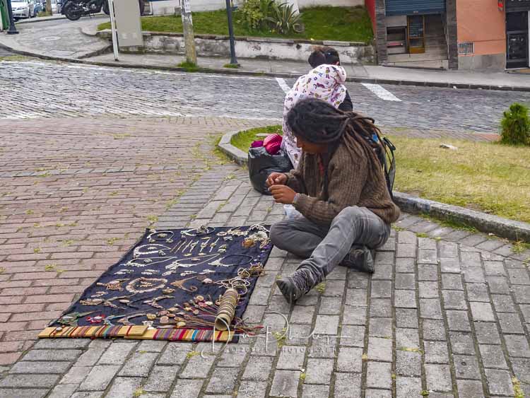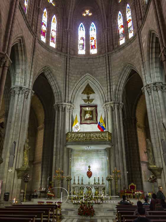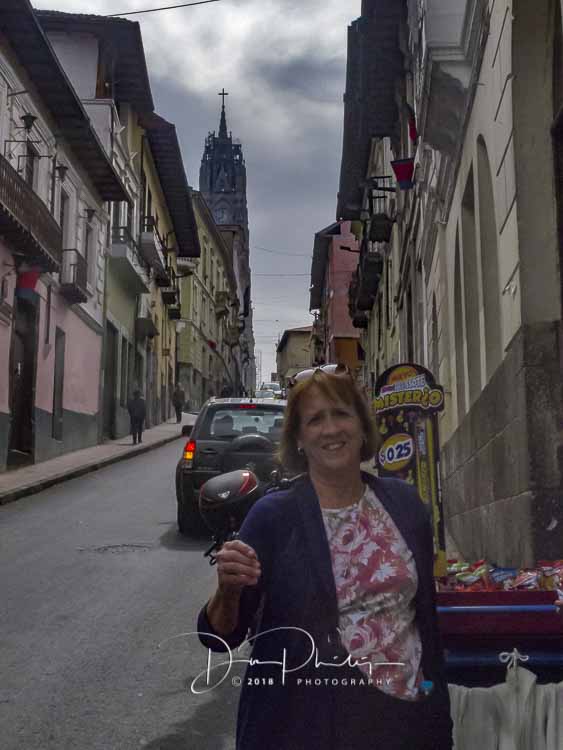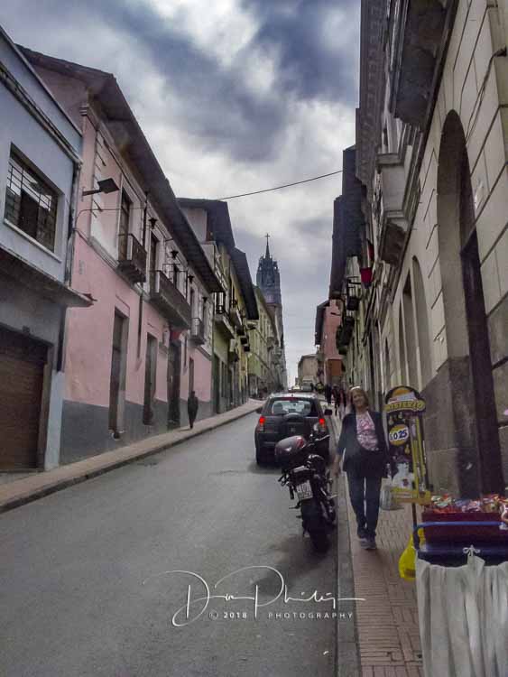 That passes quickly and we resume our hunt for the newest Cathedral, the biggest we have seen yet in Ecuador. It is an easy hunt as it sits atop a hill and is tall in its own right and we get glimpses of it every block or two. As we approach it, a local street artist/vendor is setting out his wares for the day. Colorful stores and threatening skies are everywhere! So we go inside to check out this new Cathedral.