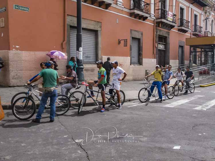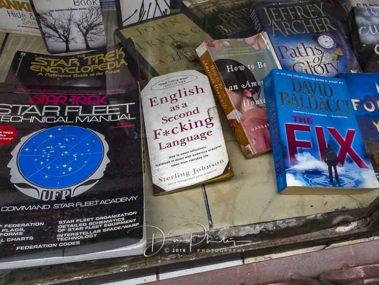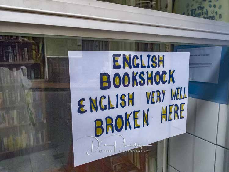 We stumble across an English Bookstore with lively titles and we stop in for a visit to find a UK Ex-Pat running his dream store. Several sights in the street including large building murals confront us on our way back to the hotel. As we arrive at the hotel, bicycle taxis appear on the corner and we have to take a selfie with our local cathedral behind us.