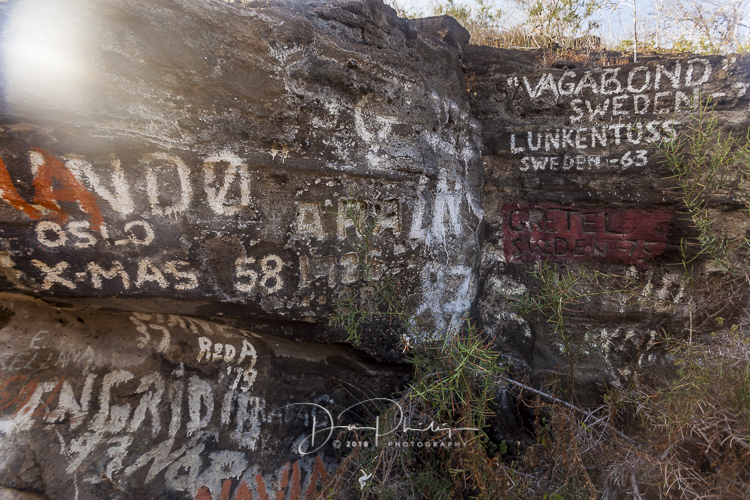 This morning’s location is interesting because it is filled with graffiti! Apparently, before the government of Ecuador took over the islands, travelers would come to this location and paint the cliffs with announcements of their arrivals! As much as we frown on graffiti today, this has become a notable location specifically because of this. The Ecuadorian Government has put a stop to this practice (Thank God!), but has not attempted to clean or remove any of the existing graffiti in an attempt to teach the hazards of allowing this. The likelihood of this occurring again is slim because now all ships have to register to even come close to these islands and only approximately 72 ships can even approach the Galapagos under special permit. This also helps control tourist damage to the islands. We have been briefed on what we can and cannot do while here.