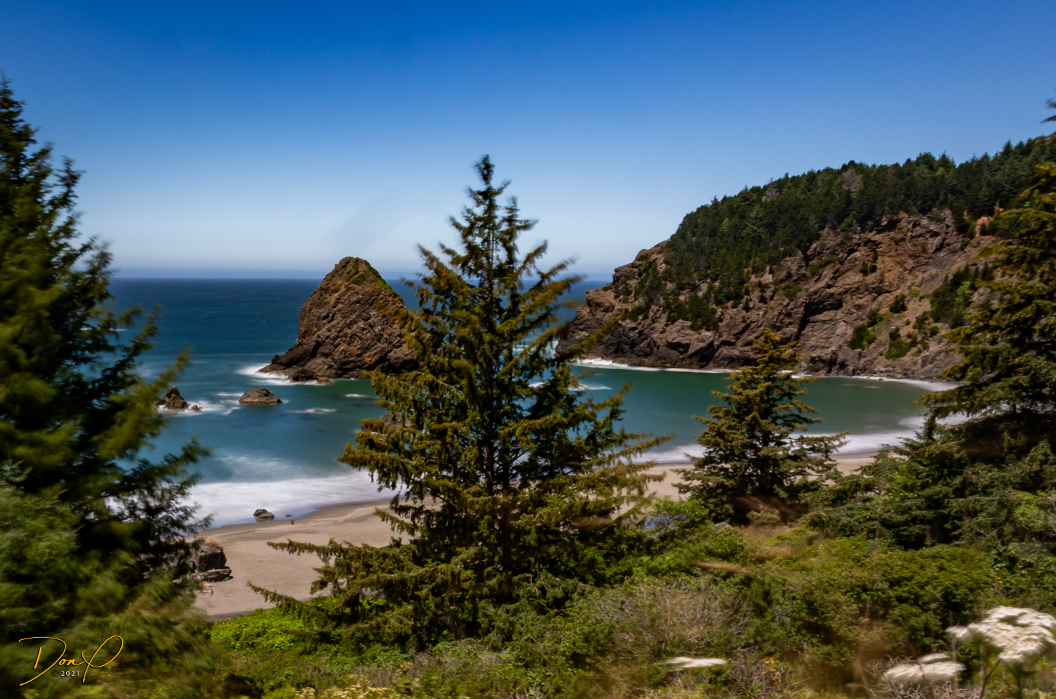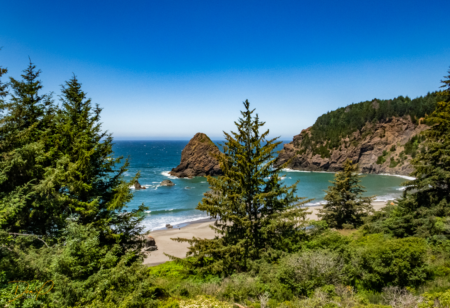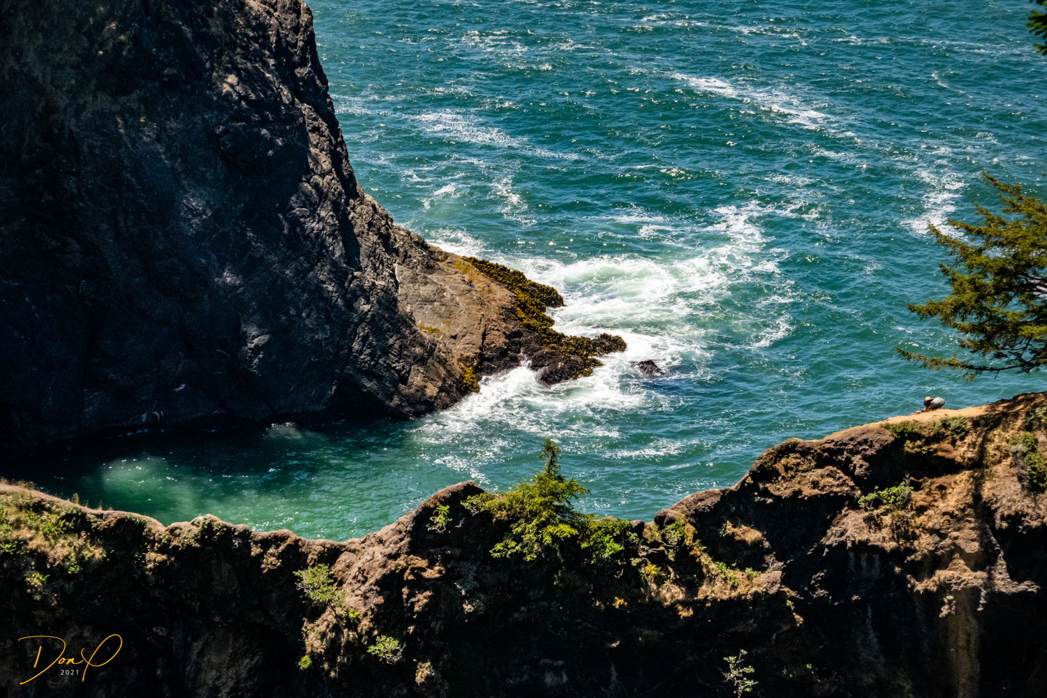 We are told there is a view of the Cape Arago Lighthouse on an island and is easily accessed from an Indian Reservation. It turns out that accessing the Reservation is nigh on impossible because the residents are tired of all the tourists and have made parking impossible. We finally are directed to a spot where, with a good zoom lens, you can get a glimpse of it!