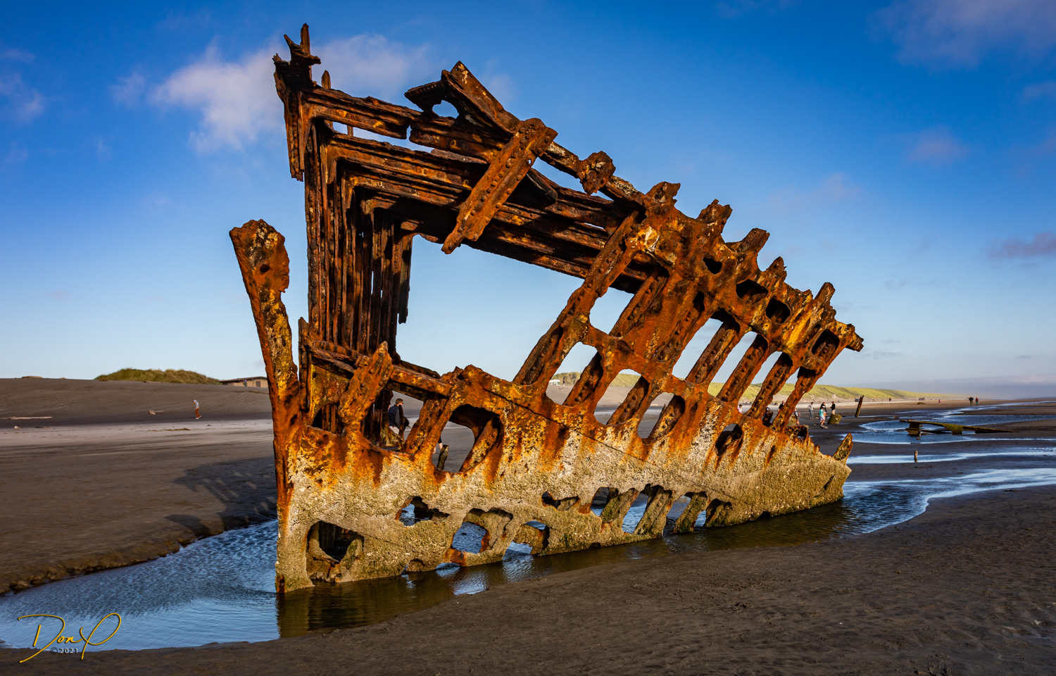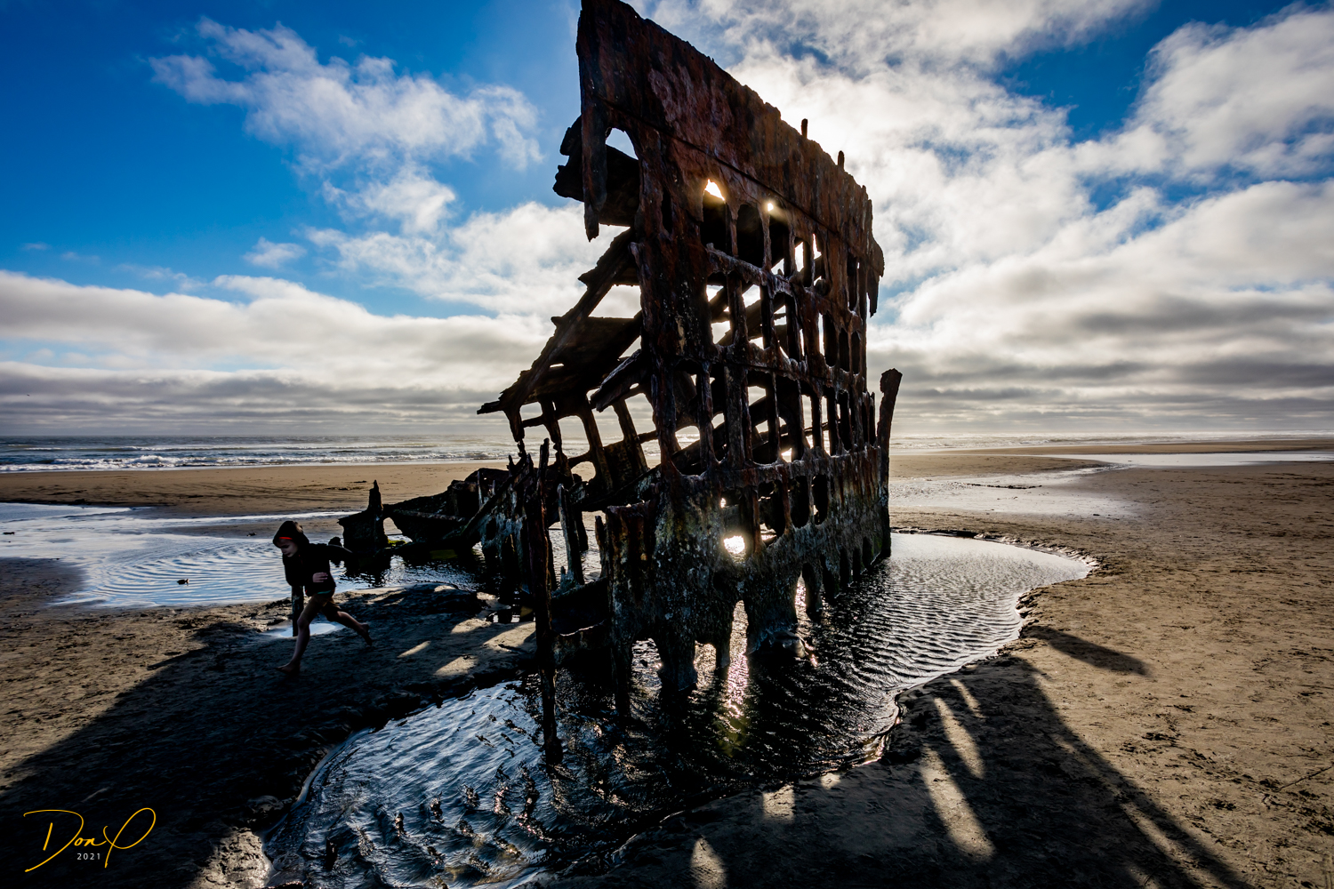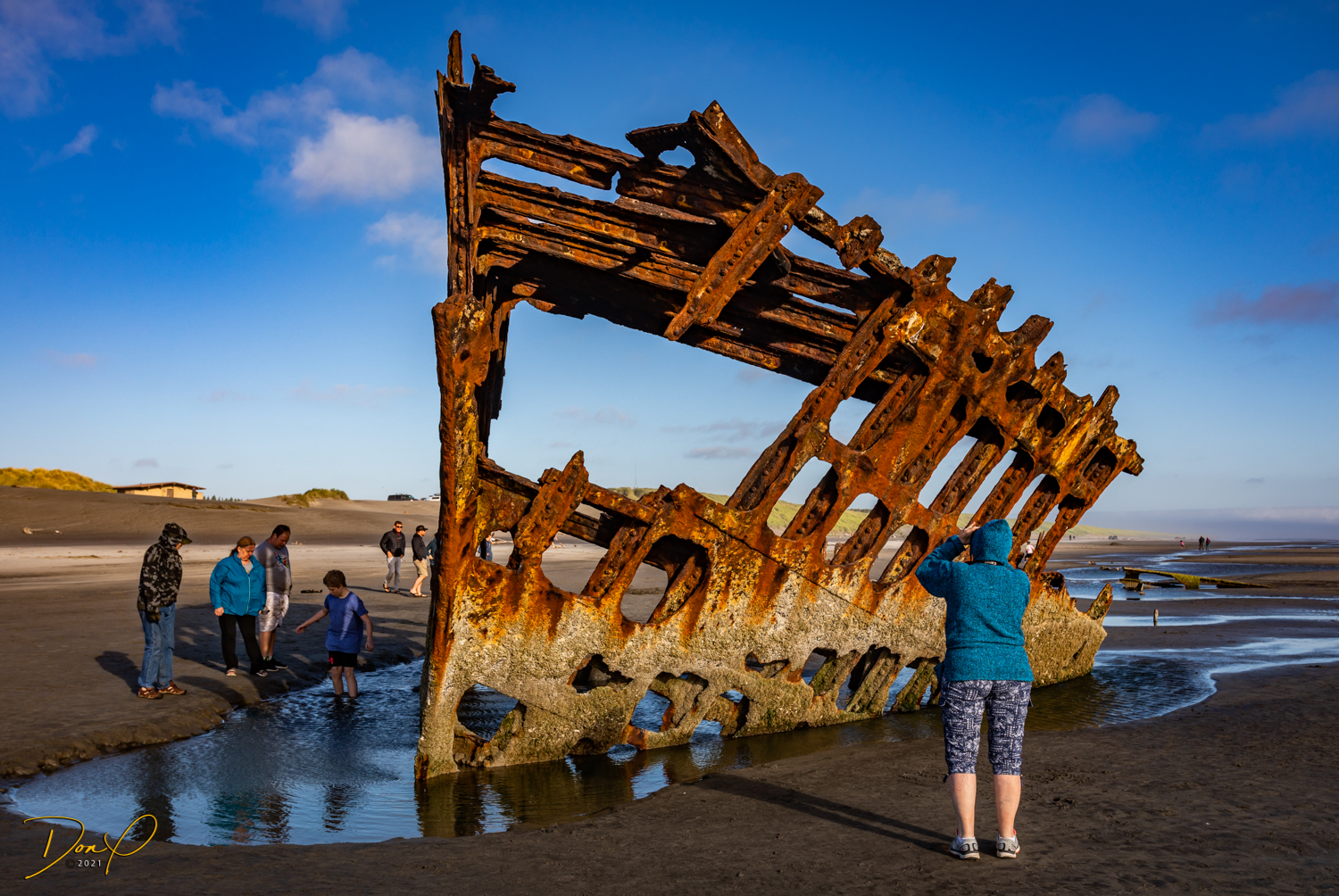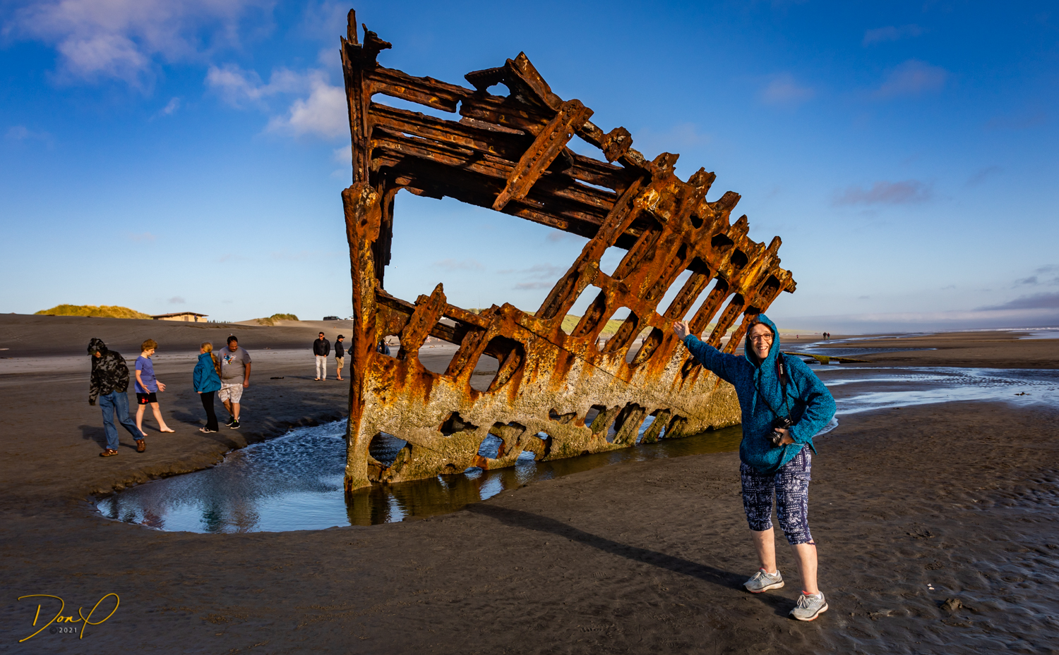 We continue driving north to Fort Steven’s State Park where we find the wreck of the Peter Iredale. It is getting near sunset and we get some fun photos of the famous wreck. As we walk away, we watch the winds blow the shifting sands along the beach, explaining in part why this shipwreck is buried so deep!