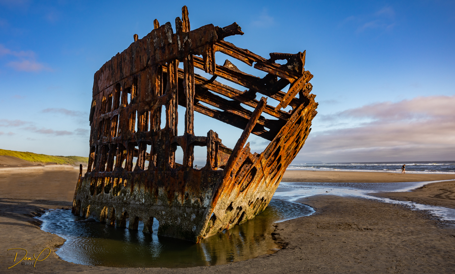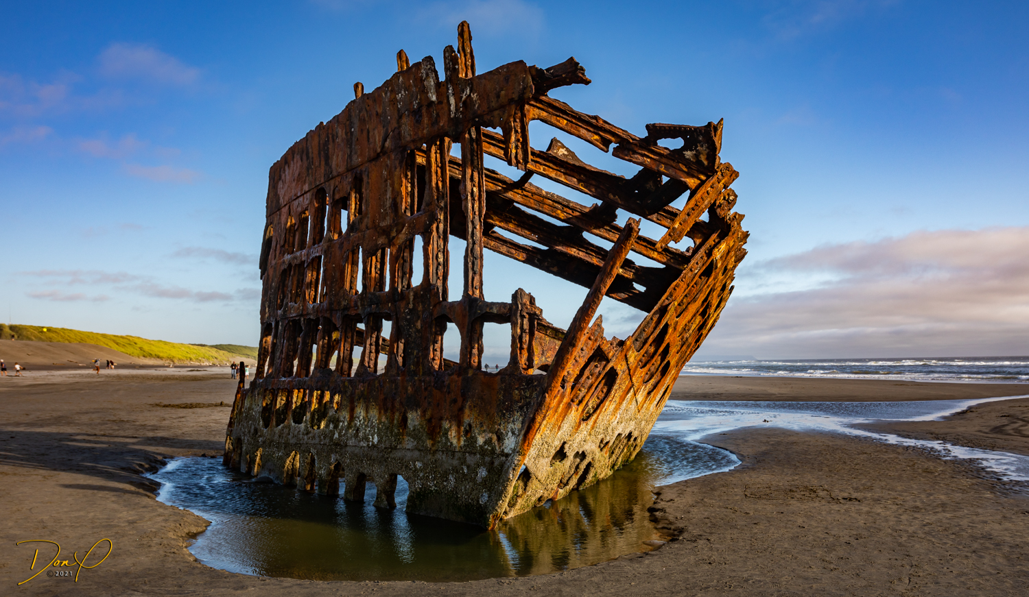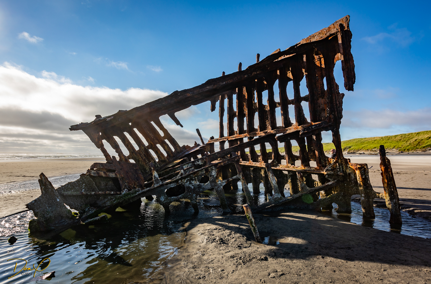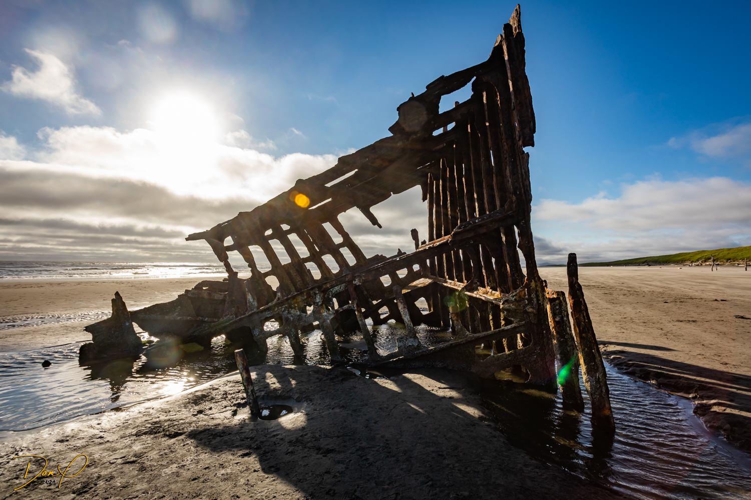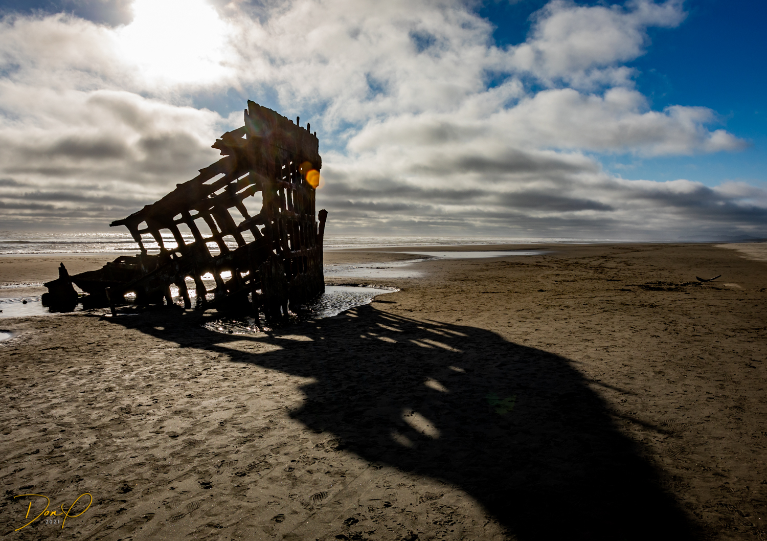 We continue driving north to Fort Steven’s State Park where we find the wreck of the Peter Iredale. It is getting near sunset and we get some fun photos of the famous wreck. As we walk away, we watch the winds blow the shifting sands along the beach, explaining in part why this shipwreck is buried so deep!