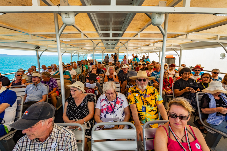 Tender Tickets in hand, we go to the Reception Lounge and chat with other shipboard friends until well after 11AM and we get the word to disembark! Much to our delight, we head for the tender and find a Local Tender Catamaran that whips us to shore in 20 minutes as opposed to the 45 minute estimate the ship gave us! The water here in the middle of the Great Barrier Reef is shallow and even the Tenders have Speed Limits.
