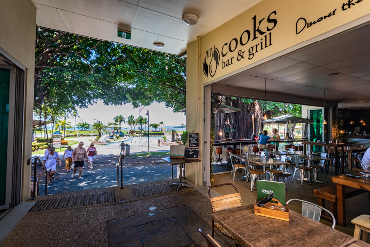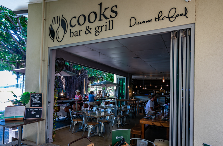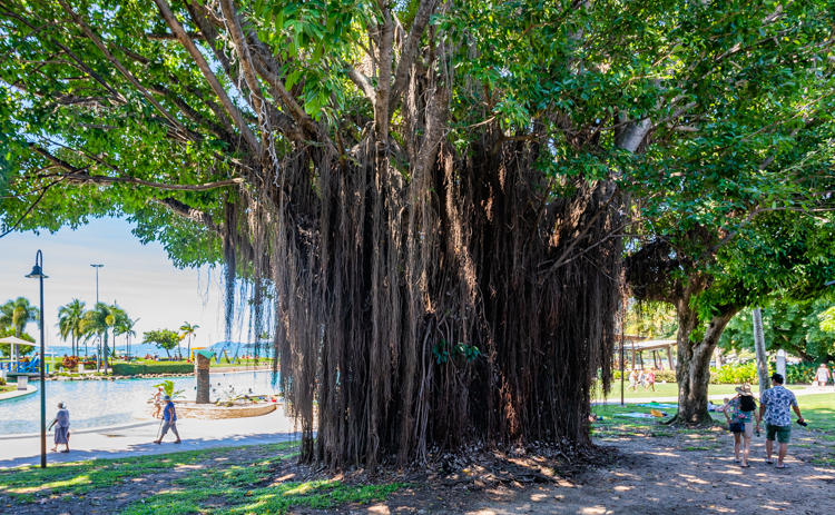 Okay, armed with these new statistics, we embark on a quest to fill a Bucket List Item to go Paddle Boarding. We find the Paddle Boarding location but there is no one in attendance. We are hungry after spending so long getting here that we walk off and find lunch at “Cooks Bar & Grill” overlooking the “Lagoon”, a picturesque man-made pool with the ocean in the background. They offer me a complimentary IPA Beer (which is really not an IPA, but tasty nonetheless) and we order a Panzone Pizza which satisfies us quite nicely. Outside the bar, we spot one of the unique trees in this area of the world that has “Air Roots” that grow above ground and absorb water from the air. With this humidity, it starts to make more sense to us!