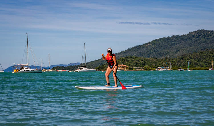 We give it a go as our Brit friends would say and our new Aussie friend instructs how to use these new toys. Soon we are paddling in the local bay. Elee takes to it more than I do and after successfully ‘Standing’ on my board for two very short sessions, I retire to the beach and watch Elee continue to struggle to master this new craft. Amazingly enough, she does master it and paddles around standing for quite some time!