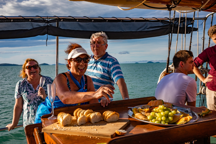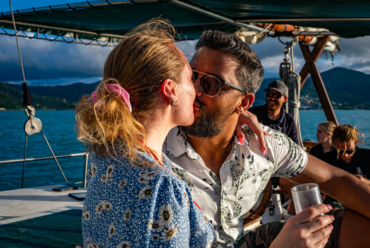 We locate the “Providence” and are asked to take our shoes off. This is not new info. We have been on many sailboats and barefoot is common. So we board and motor out into the bay. Once clear of the jetties, sails are hoisted and champagne is poured. Did I forget to mention the cheese and fruit platter? So we chat with young and older new friends and the cruise turns out to be loads of fun. Even our cameras are having a blast as just enough clouds gather for a perfect sunset and one couple poses for one of my “Lovers” photos.