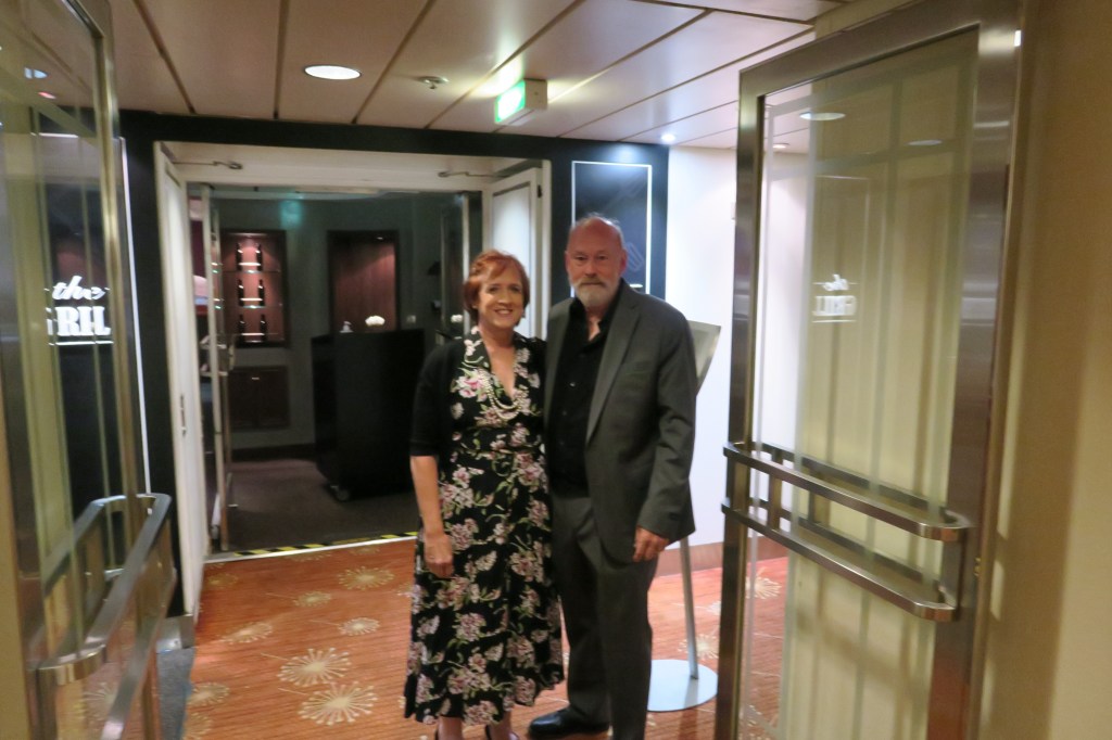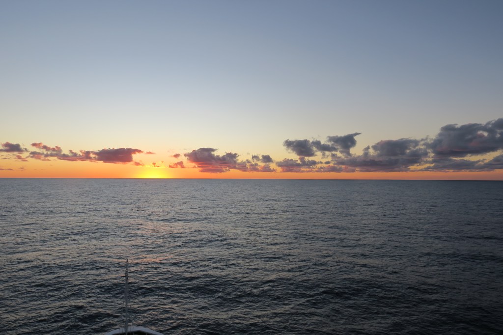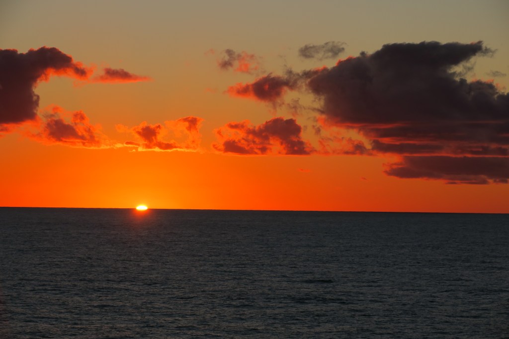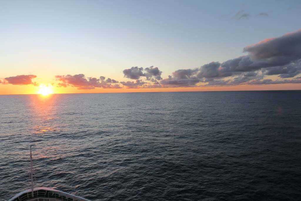 14 — Quiet. We play the shipboard quizzes with a group of passengers we have gotten to know. We consistently come in second place so we are going to name our team Avis. Some of you will get it! Then I have an hour and a half for my walk and I am building back to my 5 miles slowly. Fun note, my walking app on my phone uses GPS and adds the distance the ship travels in that hour and a half to my walk! So, today, I did 3 miles according to my steps and with the ships movement, I walked 18 miles in an hour! Then it’s time for a quick salad lunch and it’s on to the afternoon. Afternoons bring me to card playing and I am getting better at Whist. Then it’s off to the afternoon quizzes which are harder yet. Still, we come in second place! Back to the room to finish up my photo editing and relax until evening. I think tonight’s show is a Cabaret performed by the ship’s crew. And we’re told it’s “Formal Night” again. What’s up with that? It was Formal Night 3 days ago! I guess we’ll eat in the Buffet tonight. At sunset tonight we once again witnessed the “Green Flash”, that moment at sunset when the sun flashes green right as it disappears! Yes, folks, it’s a real thing!