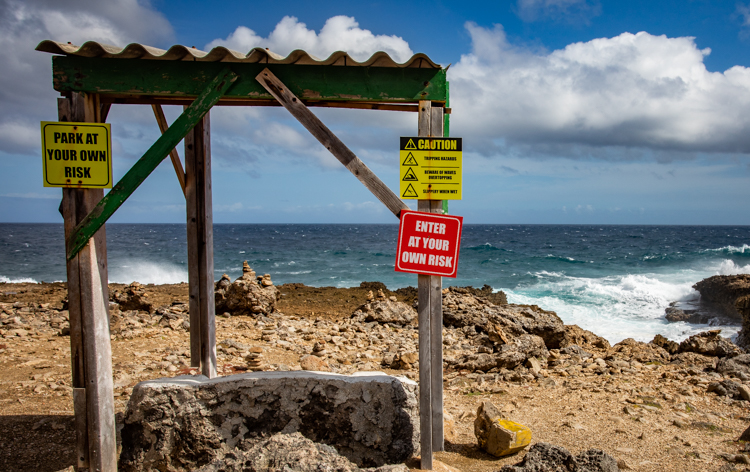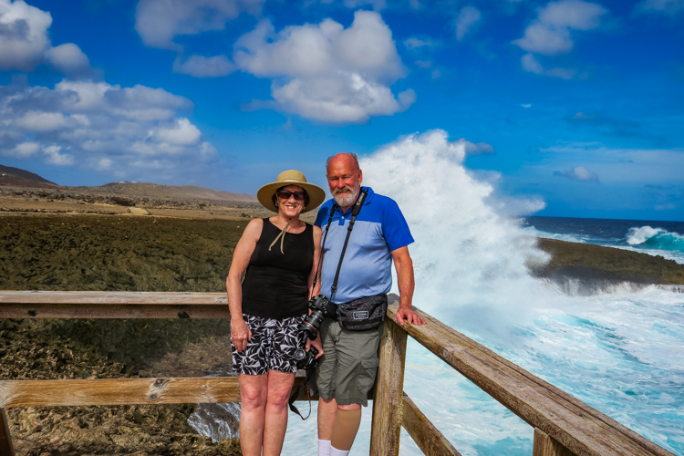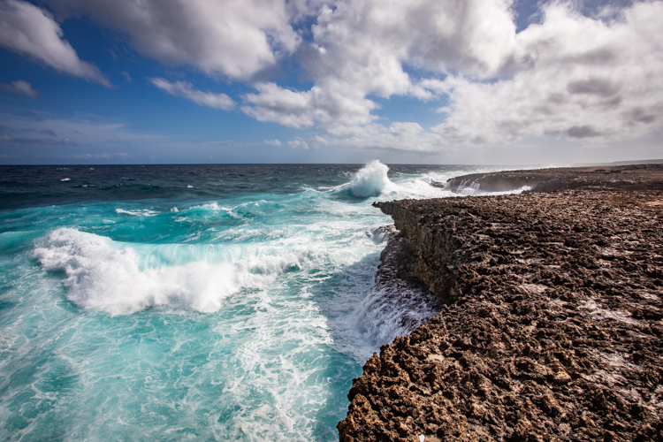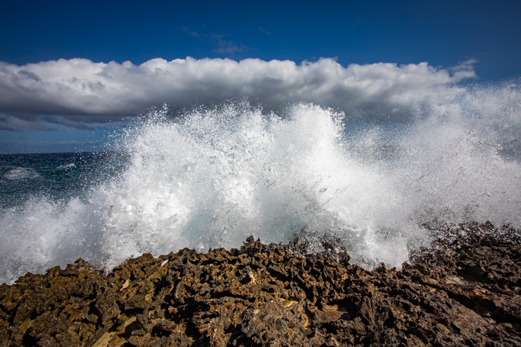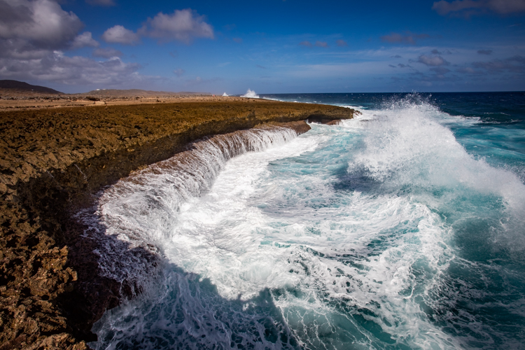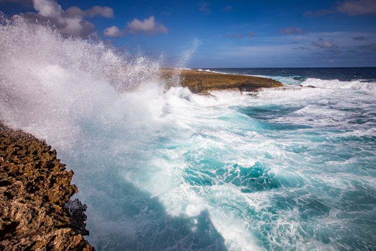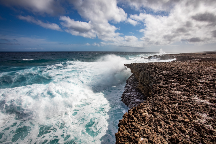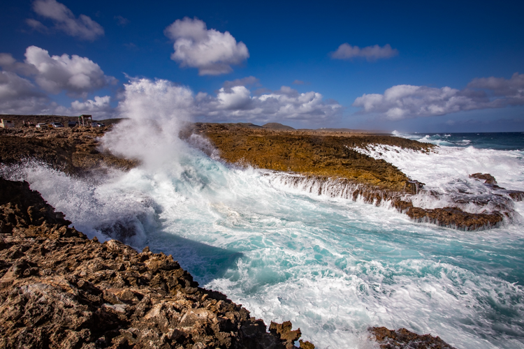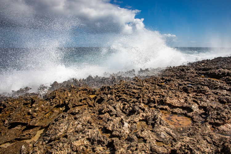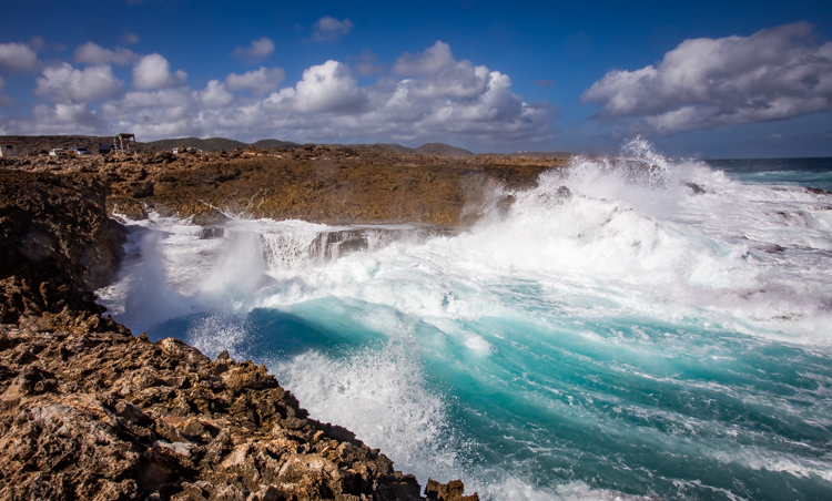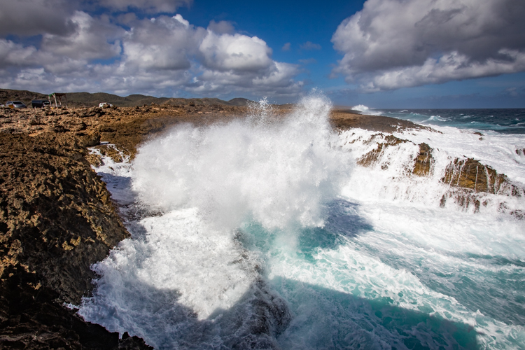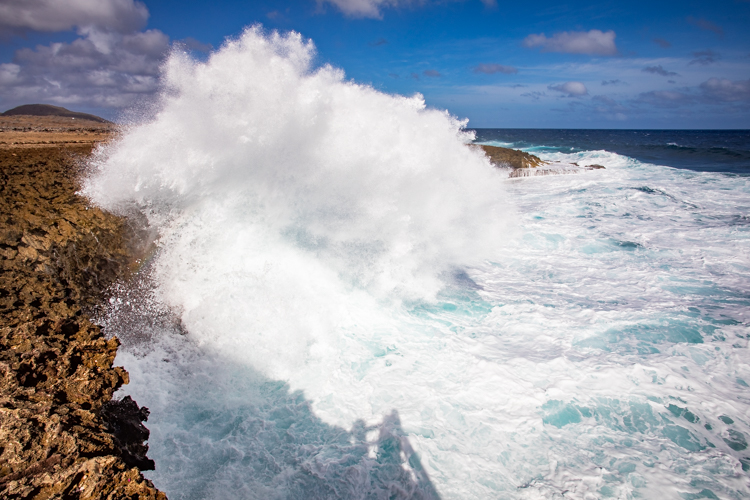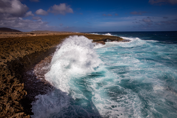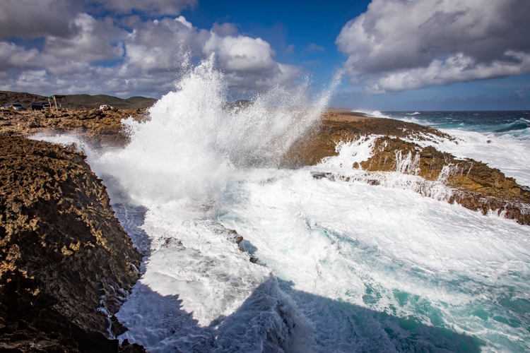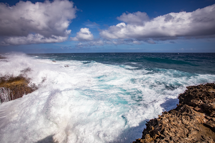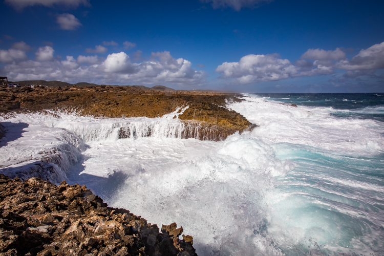 We visit the north side lava shore where the high surf makes the entire shore like one big blow hole! Waves crash and rumble against the lava rock and erupt into the air, sometimes 30 or more feet high. Cameras happily click away and wait for the next thunderous crash. Many dozens of photos later we move on to an even more spectacular spot, Bon Bini Beach in Shete Boka National Park, where the waves perform for us again in a sequel that outperforms the first spot.