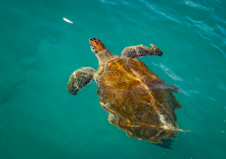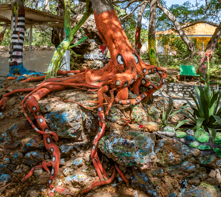 Then it’s on to visit Turtle Beach, also known as Playa Piskado, where sea turtles swim. At the entrance we stop for a quick photo of Octopus Tree, a fun tree where a local artist has used his creative vision to decorate the tree and its exposed roots. The turtles, partly domesticated by a local who calls them by name and they come when whistled at. We walk out on a short pier and watch their antics as small fish are tossed about to feed them. People swim around them and are cautioned not to touch them.