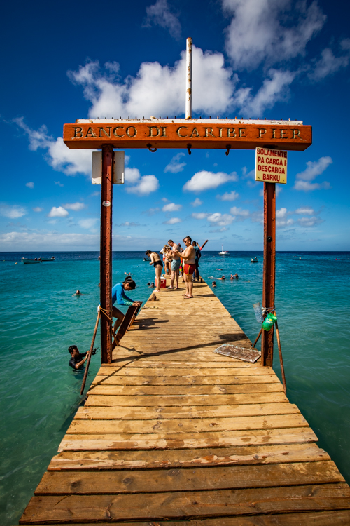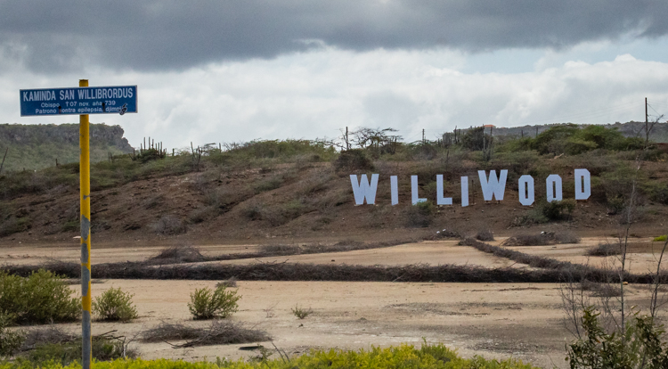 Moving on, we travel a short distance to Playa Knip. A beach rated the 8th most beautiful beach in the world. Wondering what we will see, we arrive in a very crowded parking lot that could be at any beach in the world. We get out and walk towards the beach and soon see why this place is so renowned. The water is azure blue, that color the mesmerizes the eyes and the sand is pearl white and smooth. The beach is framed with volcanic cliffs where beach goers jump off into the crystal clear azure water. A truly spectacular sight for the eyes and any camera lens, we proceed to feed our camera cards with images that satisfy as much as a 5 star chef would fill a belly. As we drive away, we see a sign depicting the Hollywood of Curacao, Williwood!