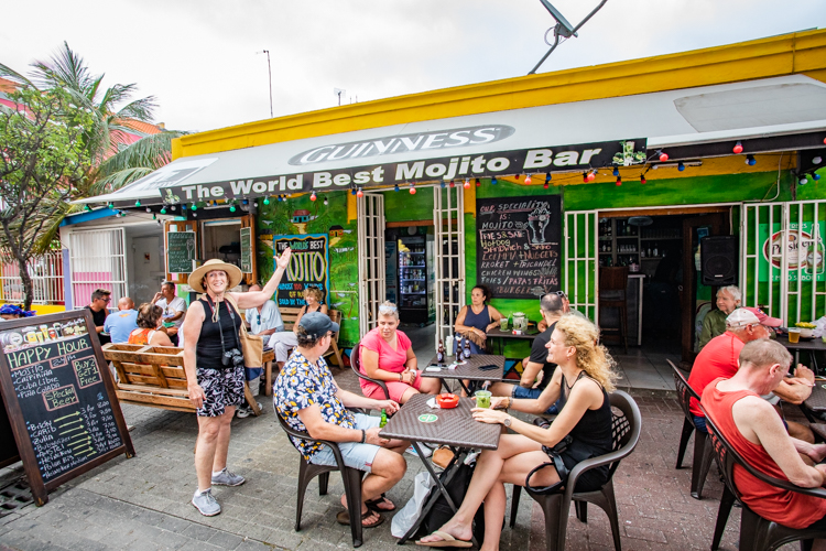 Walking back to the van, happy chatter with the other passengers ensues on the way back to the van. Then it’s a 20 minute or so final journey back to Willemstad where our ship awaits. But we all ask the driver to drop us off at a walking bridge towards the shopping district as we still have several hours before the ship is scheduled to depart. We walk about the picturesque town, cameras still clicking happily and we find some sundries to make our journey more pleasant. Then we spot a sign that brags The Best Mojitos in the World, and we just have to check it out, especially considering they also advertise Happy Hour! They are surprisingly quite good! Mojitos in our tummies and sundries in our sack, we make our way back to the ship.