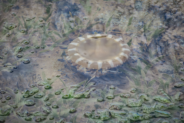 Unfortunately, we soon are coerced into leaving this magnificent place and work our way back towards our cruise ship. We do get one more stop at a series of lagoons where we’re told we can see flamingos. The driver points in the direction for us to walk as she is not comfortable leaving her van on the side of the road unattended. We trod happily off in search of these pink birds. One appears in the distance but too far away for even a zoom lens. We continue walking and are mesmerized by what appears to be anemones in the shallow water but turns out to be a form of short tentacle jellyfish and our cameras make their best attempt to emblazon their images for our future memories to relive. We walk as far as the path will allow and finally do see a group of seven flamingos off in the distance and my zoom lens does it’s best to capture an image.