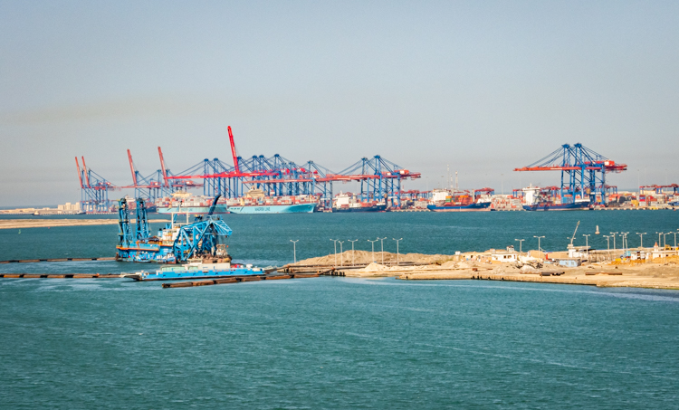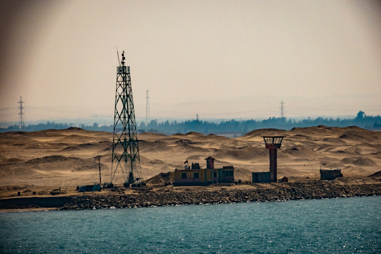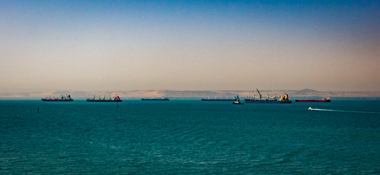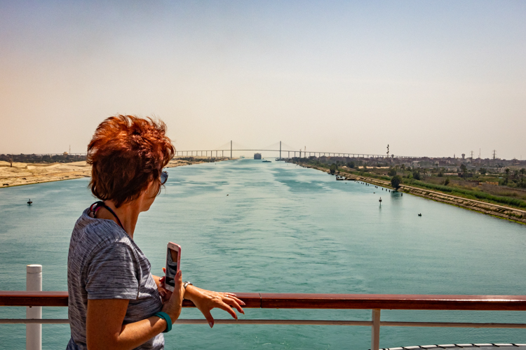 We pull up anchor around 4:00 AM and enter the Suez Canal. It is not anywhere as spectacular as the Panama Canal, but is interesting in it’s own right. I’m going to call it “The Ditch in the Desert”, because that is an apt description for it. Piles of desert dirt on both sides of the Canal greets our senses as we sail along.