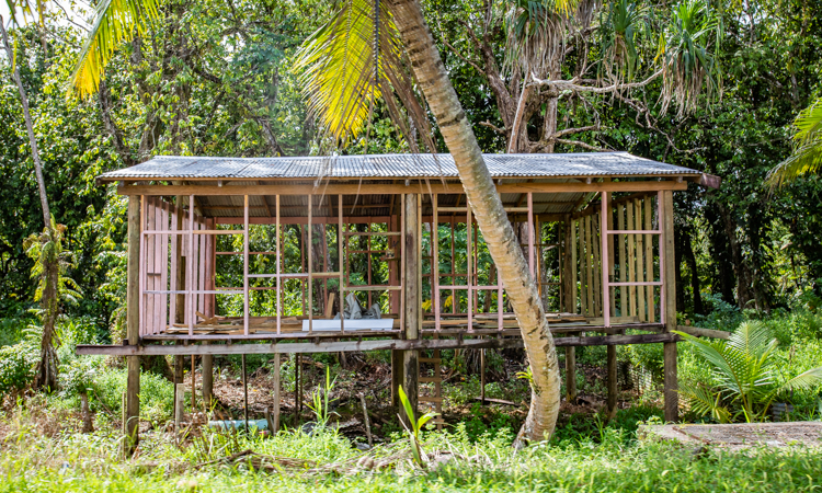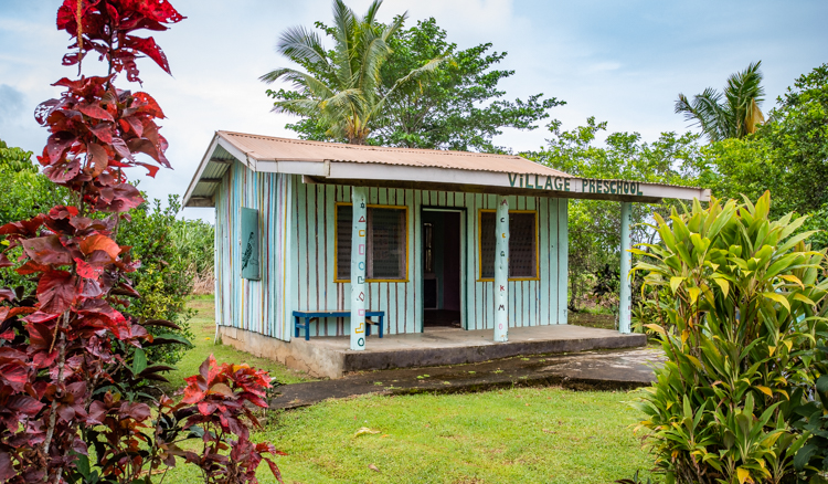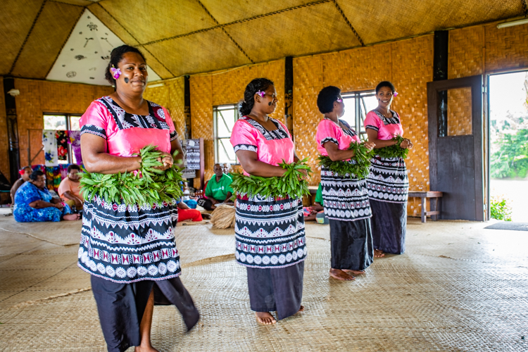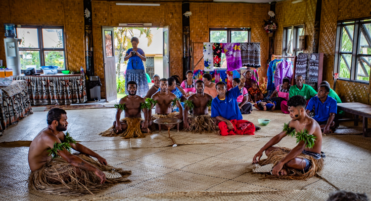 We then walk through another torrential downpour across the village to our lunch building where tables are spread out with food adorning them. The floors of the building are covered with woven mats from the Pandanas Tree Branches. We are asked to remove our shoes and go barefoot. We are welcomed in a ceremony that converted us from guests to family and we are told that if we ever return, we are already family and will be forever.