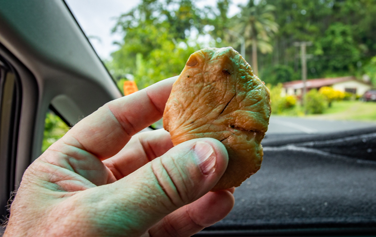 Thomas takes us to a fruit stand that he knows and he buys us some cooked tree fruit called “Evee” and described that they cooked it after peeling it. He passes it around to all of us and we each take a piece. We all take a bite and out of respect for the interior of his car, we stoically chew it and swallow. I am sitting in front with Thomas and I keep taking bites and swallowing, trying to finish it before I wretch. To my great relief, Thomas’s attention is distracted by a sight out the window and I am able to toss the remaining fruit out the window. (I will find out later that my fellow passengers also threw theirs out the window!)