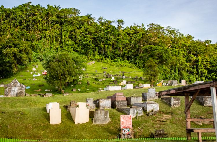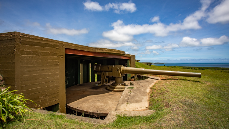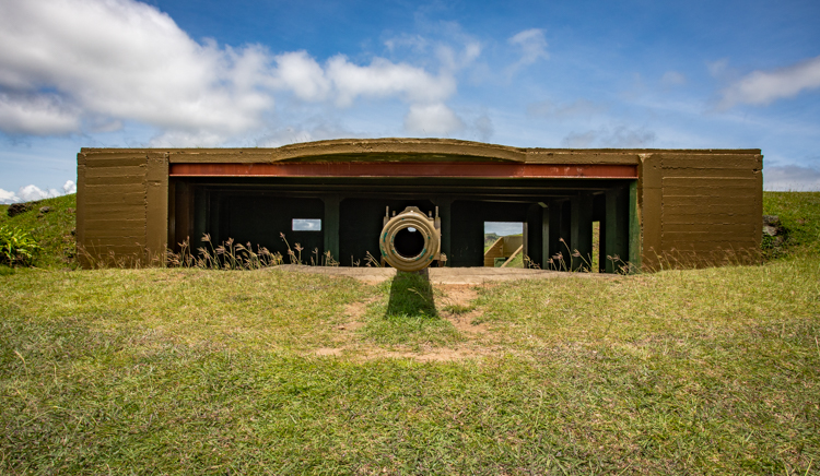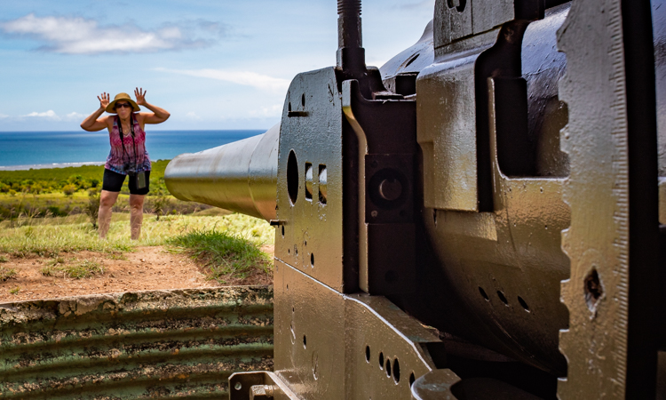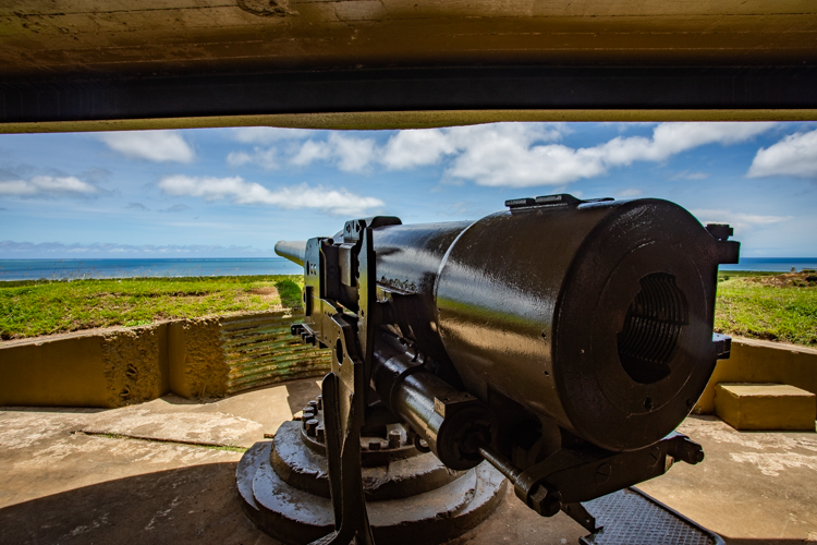 Many more roadside sights attract our cameras as we drive on and arrive at the Momi Gun Range, a WWII embattlement with 6 inch guns that once protected the islands. We check our clocks and see we have been traveling for over 4 hours at this point and we only have a 6 hour tour. So it is clear we will be on at least an 8 hour tour or more. We walk around the battlements for about a half hour and our cameras are playing happily again.