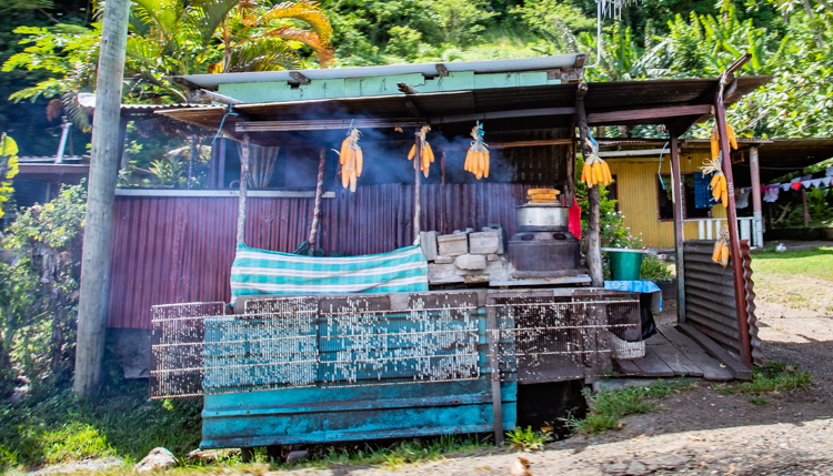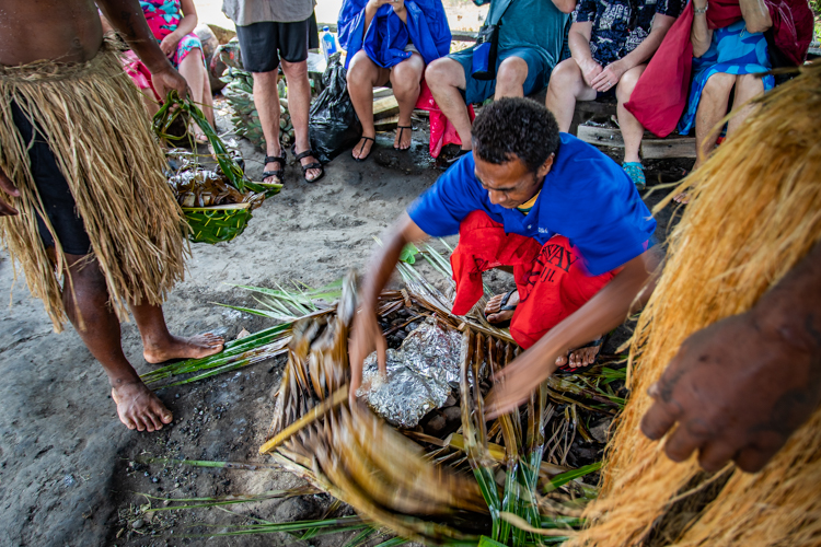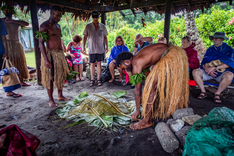The Fijian rain soaks you with warm water that is not uncomfortable. Then you dry off naturally in a very short time. This is the rainy season, actually it is Cyclone Season. Luckily, for us, no Cyclone comes through while we are here. But it rains torrentially hard for 5-10 minutes at a time and then stops suddenly for an hour or so. Our hosts bring us to the Imu Pit (They call it something else in Fiji, but the name eludes me) where the Chicken for our lunch was cooked underground. They uncover it and we watch as our lunch is removed from the pit.