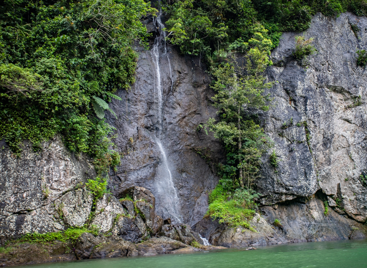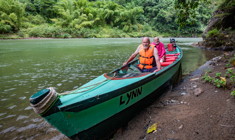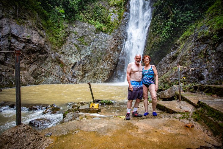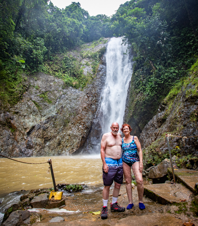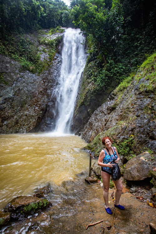We are greeted by the Village Elders who are not that elderly but rather young and we are immediately escorted to river canoes after storing our dry clothing. We don ponchos and acquire plastic bags to put our towels in and we are off in wooden canoes that have 40hp outboard motors attached. We cruise upriver and even through a couple small rapids. After a half hour fun river ride with a pilot named Ti, we go ashore for an uphill walk to a waterfall.