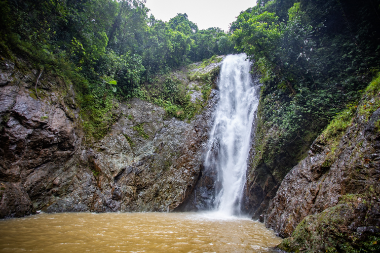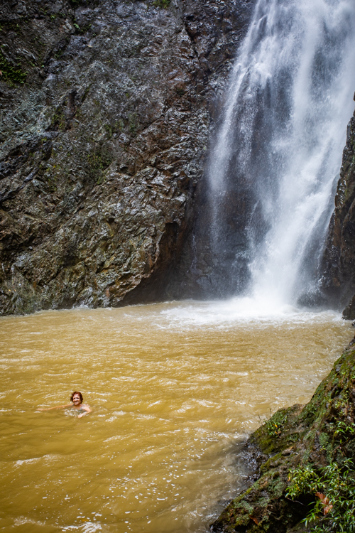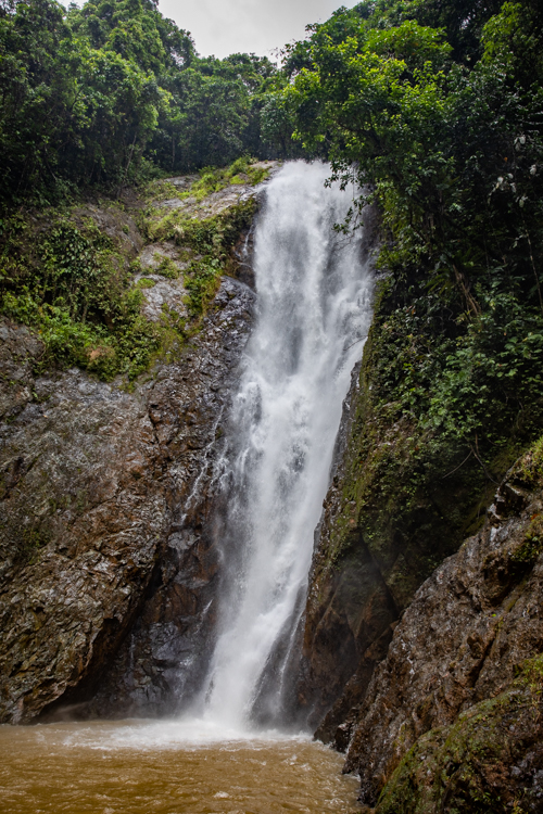This waterfall, Wiacomibe, is about 150 feet high and cascades into a pool of cool water. Several people wade into the pool and it becomes a small party in the water. One of the guides is seen climbing the slippery wet cliffs next to the falls and before you know it, he high dives off the cliff into the pool. He does this a couple times and I catch him with my high speed shutter as he jumps from about 100 feet. I have to keep drying the lens as the mist gets everything wet.