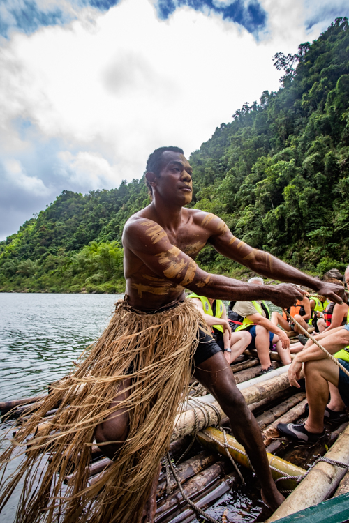 We walk back to the canoes and the lady in the front of mine graciously gives me and my camera the front seat. My camera is thrilled at her generosity and we head out on the river. A short distance down river, we stop at some bamboo rafts and we are invited to float back on the rafts. Many members chose to ride the rafts while I and a couple others decided to stay in the powered canoes. Glad for my decision as it afforded my camera some interesting views of the rafts and one guide member who dressed in traditional garb including body paint.