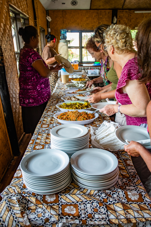 We are then invited to join them for lunch, a treat we are waiting for as the tables of food go on for ever on one end of the room. We try all the dishes and are not disappointed. We even try the Taro Roots and Taro Leaves and expect to not want to eat them. But they are so delicious we go back for seconds! We eat rice, stir fry noodles, fish and chicken cooked in the Imu Pit among other dishes that we cannot name but enjoy thouroughly.