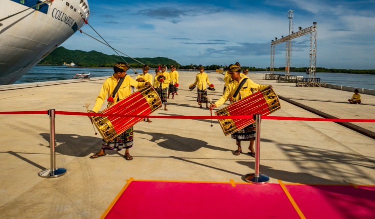 Back on board, we go to dinner and I take a nightcap back to my room and write for you. I break for a moment and go get a glass of wine and see a bit of a “Beatles Night” where a couple Crew Singers entertain the masses with Beatles Songs. This is interesting because we have received an announcement that we will be spending the night here and leaving tomorrow night. It seems that we will NOT be going to the Indonesian Port of Surabaya in two days but will be going to Semarang next.
