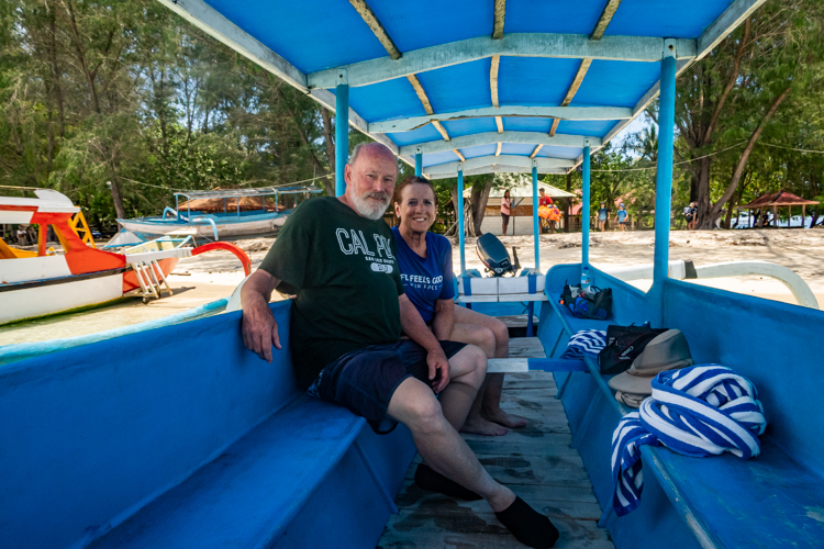 We go back onshore and use the very crude restrooms which amount to ceramic holes in the floor. Our boat guides take us to a “Turtle Rescue” where we see tanks of Sea Turtles that are being helped to survive to replenish the species. Then we find a restaurant building and buy a couple bottles of water. We question if there is fish food to acquire for snorkeling and are directed to another building where, for 2000 Rupiahs (about 15 cents), we buy empty water bottles filled with bread strips. The caps have holes drilled in them. We get back in our private boat (which cost us $40 USD or 560,000 Rupiahs) which is ours for the day as long as we want. What would YOU expect for a half million?