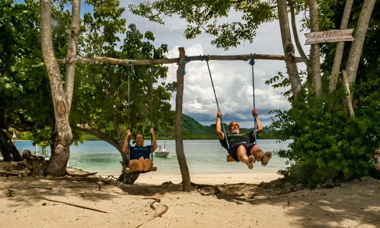 I get back to our boat and I am finished with my time in the water. I sit in the shallows and take my fins and snorkel gear off while watching Elee complete her adventure. There is a lot of debris in the water, both natural and trash, which saddens us. At one point in my snorkel, a plastic bag wraps around my head and I freak out for a moment until I untangle it. Elee tires of the debris also and comes to shore. We grab our cameras and take random photos of the island and even some of us on a swing that has been built and both us and our cameras are happy.