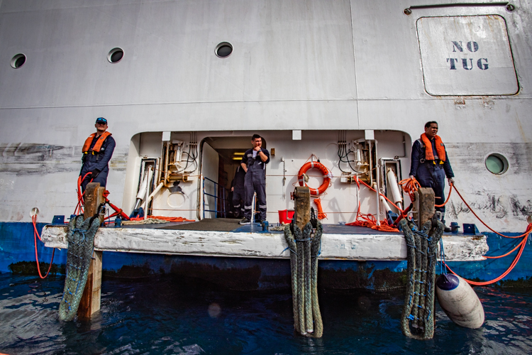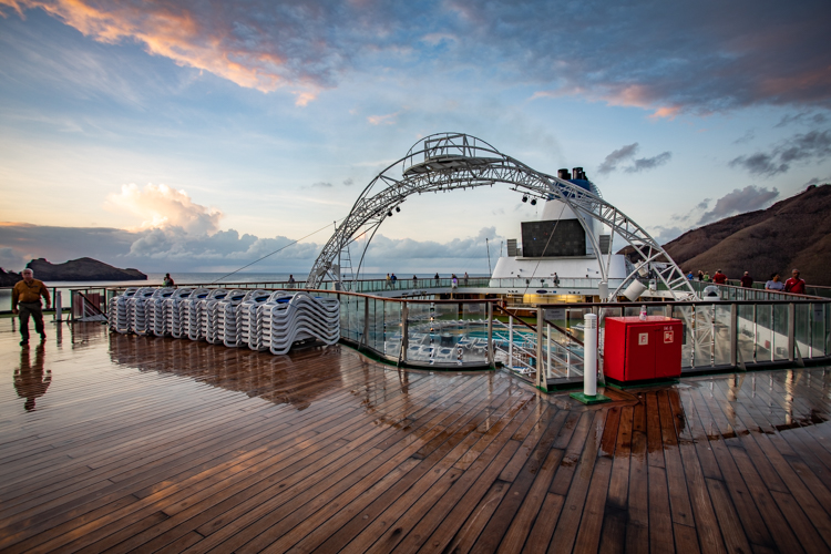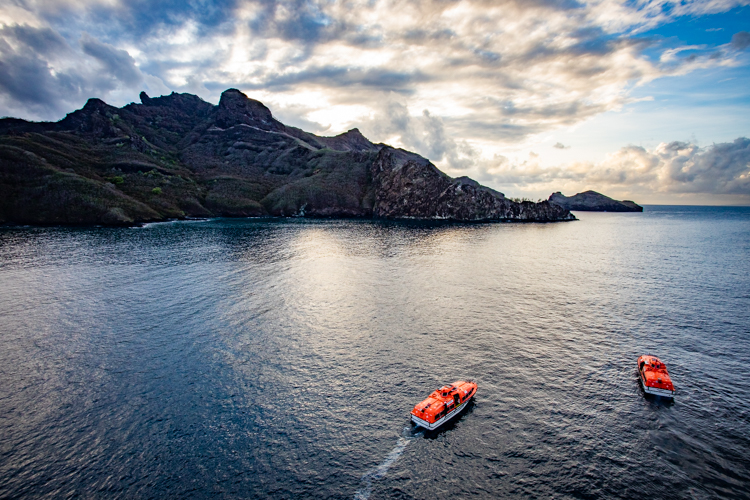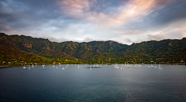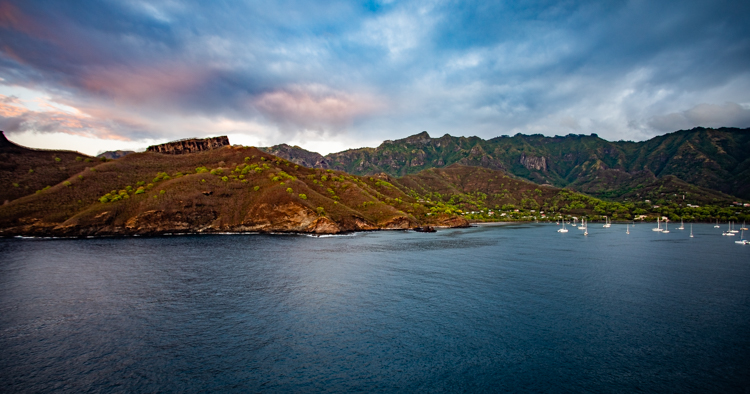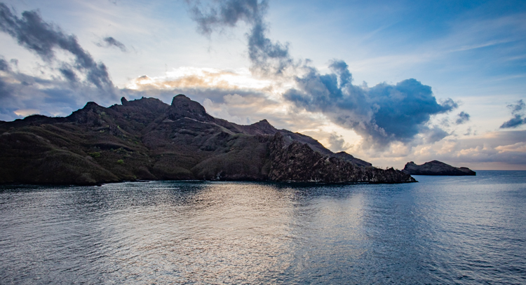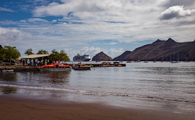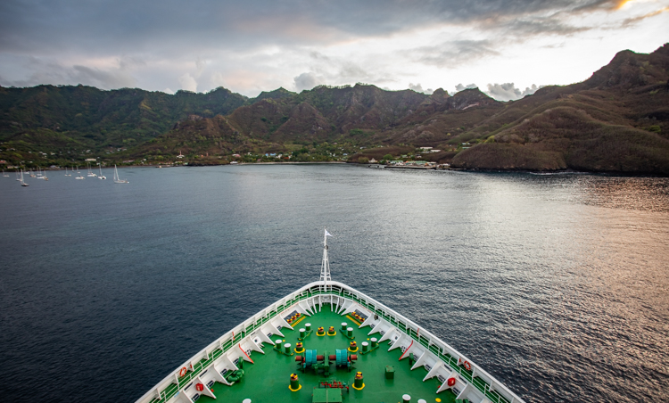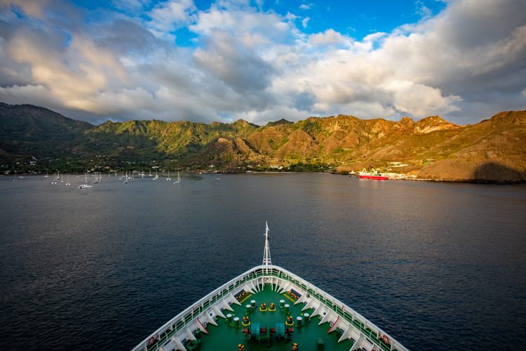 We awake early around 5:00 AM to the view of dark volcanic mountains outside our window. Sleep, not being anywhere near as important as the sight of land, eludes us and we arise and prepare for the day. As my cameras drag me up to the top of the ship and out on deck, the magic of Nuku Hiva casts its spell upon us. Photos of the sunrise climbing over the mountains are created and the last 10 days on the ship seem all worthwhile. A break for breakfast and that ever powerful cup of coffee and we are ready for the day.
