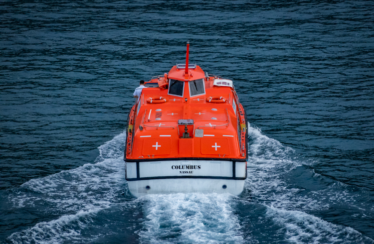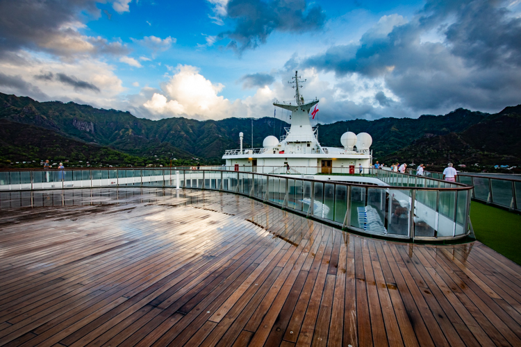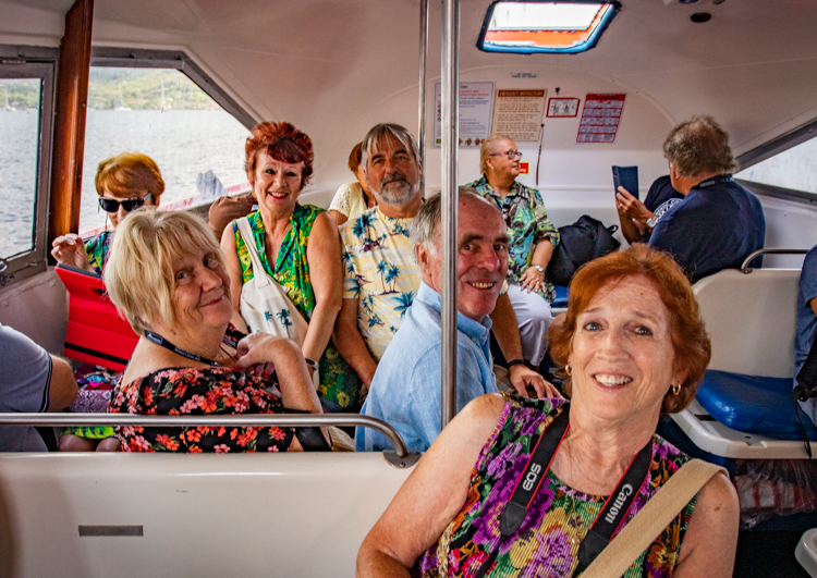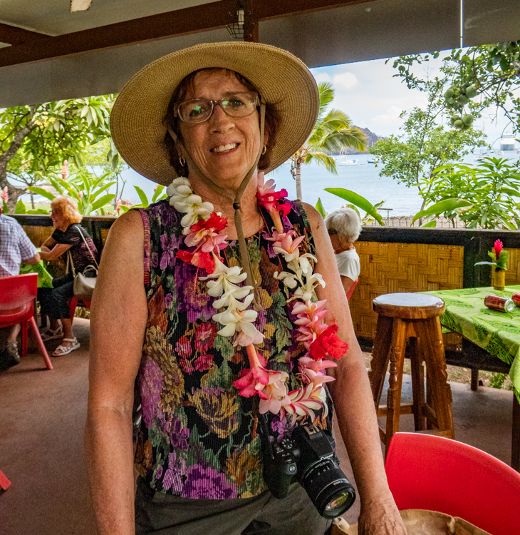 Our food arrives and we have to call the waiter over because he has delivered it to the incorrect table where the patrons were more than happy to eat it! Luckily for us, we catch the waiter before the other patrons take a bite. Both meals are delicious and the beer is cold. A lady approaches us and gives Elee a Lei and we are told it is to be passed around. So we take her photo and pass the Lei on where we watch it go from lady to lady around the restaurant. The walk back to the ship is leisurely and many more photos are taken. We find our token magnet for our wall and soon we board the Tender for the ride back to the ship.