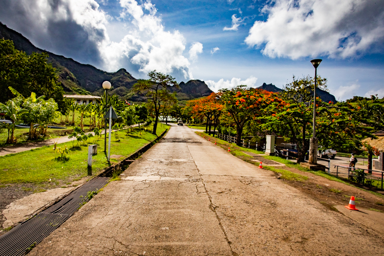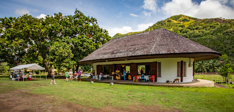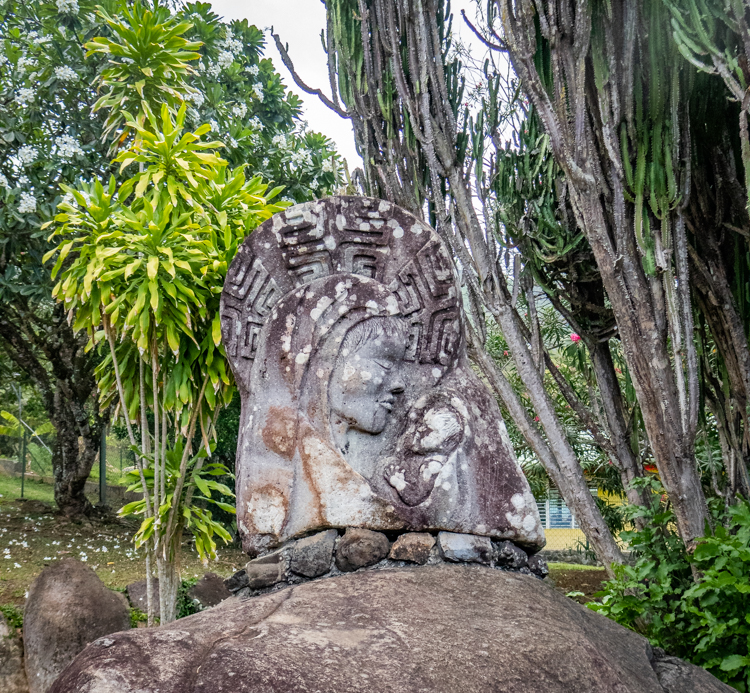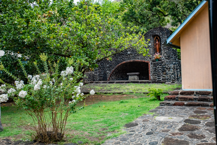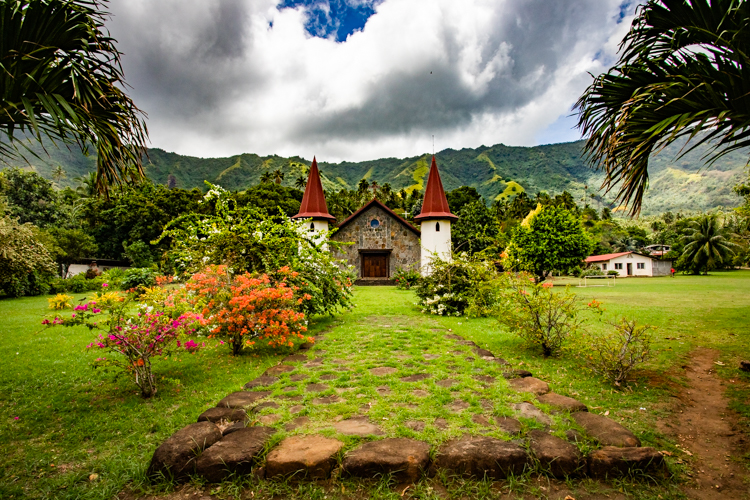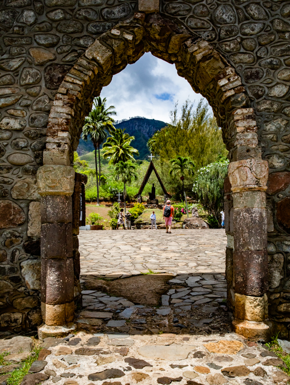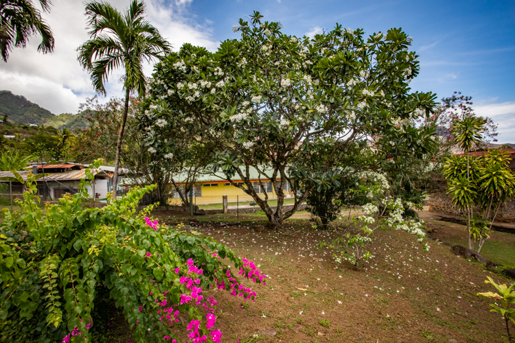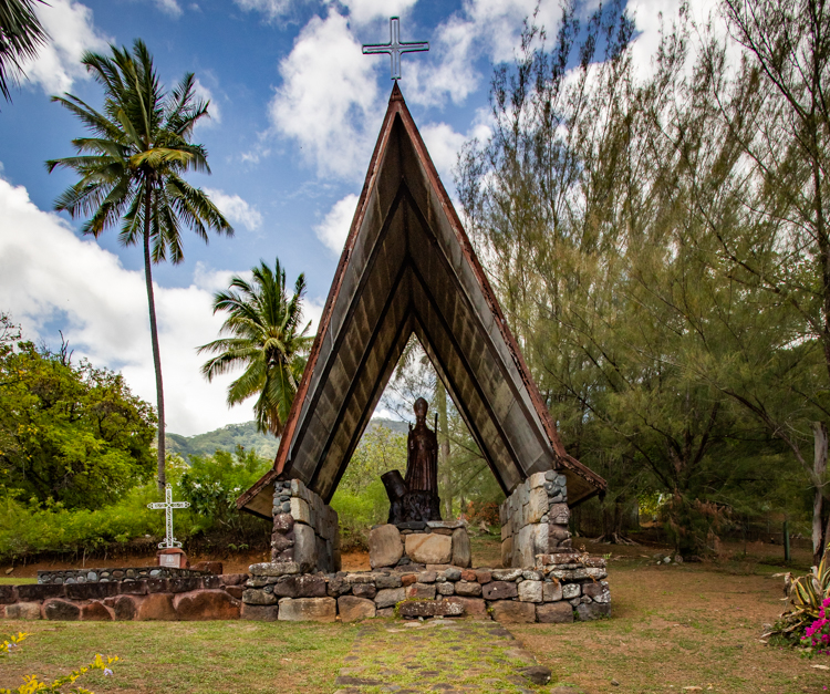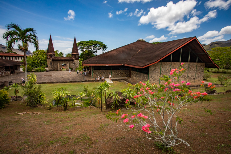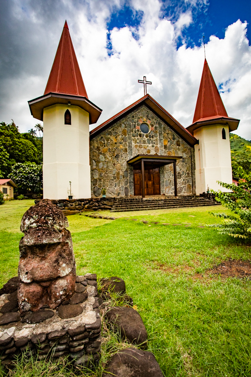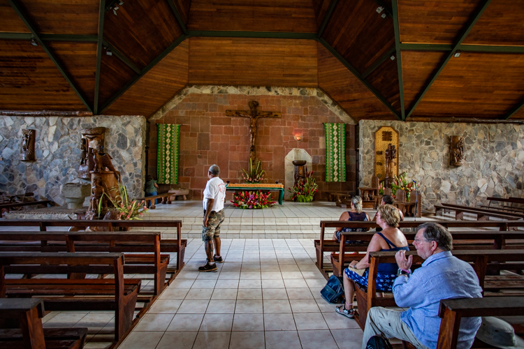 Tajaka then takes us to Takao de Marquesas Church and find the charm of the island inside and out. The pulpit is carved from one tree. Fairly plain but then we are on a very poor island. Walking along the shore, I accidentally slip and fall and scrape up my arm. Tajaka gives me an old t-shirt to tie around it and we make it back to the port. We are dropped at the Our Lady of the Marquesas Islands Cathedral and we walk about and see the place.