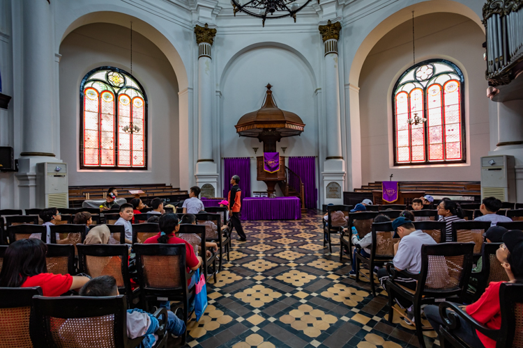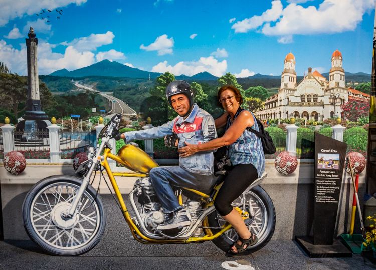 So we agree and go with them to the SUV and drive away with Wawan (pronounced Juan) and the English speaking guide, Mindny happily chatting away at us. They take us to GPIB Emanuel Church where we make a donation and are allowed inside to take photos and witness a children’s class taking place. Outside, a group of young school kids are happy to have their photo taken. Then we go into an antique store that closely resembles a Flea Market back home. The fun part of this store is when Elee takes a motorcycle ride with the country’s president!