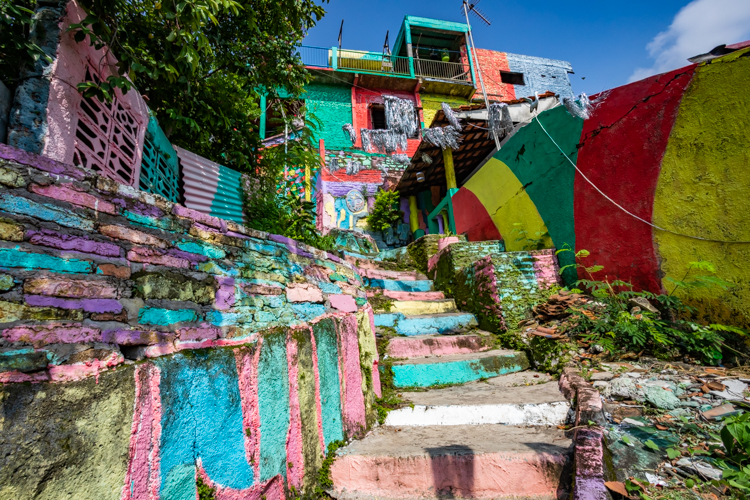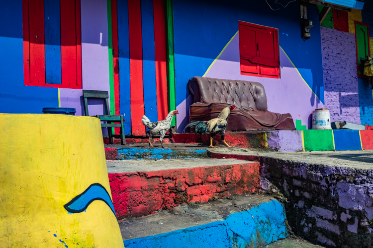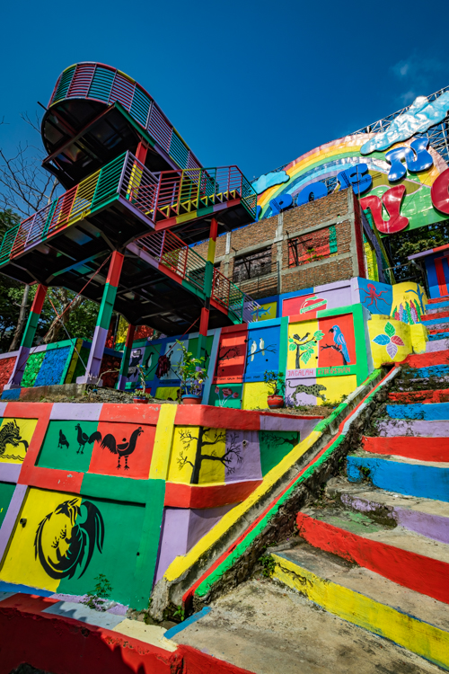 We then travel on to the “Rainbow Village”, a very poor village that decided to paint their houses in rainbow colors to attract tourists. The village is on a hillside and the painting scheme works very nicely and tourists abound here. There is a somewhat difficult climb to the top of the hill, where someone has built a colorful sign and a scaffolding and stairs to overlook the village. My camera urges me to climb the steps even though Elee decides to only go about halfway. My camera is thrilled we make it to the top.