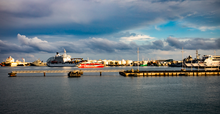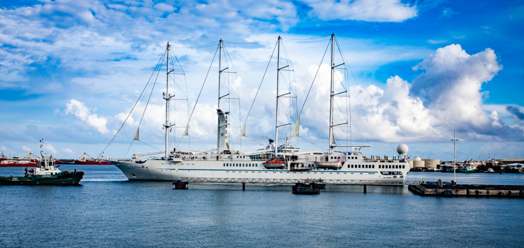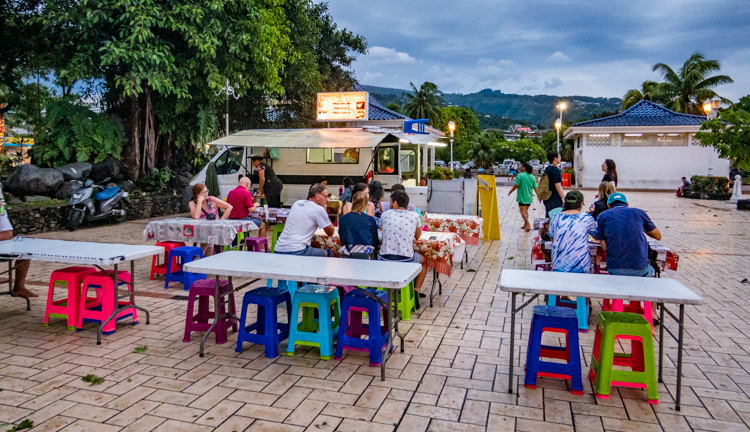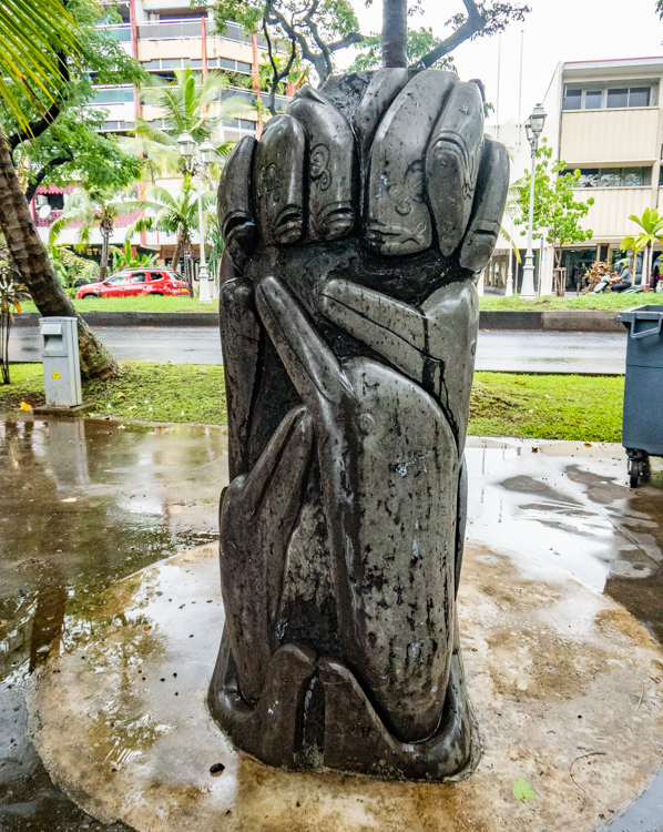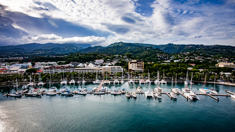 The island of Tahiti is in sight and light rain is falling. The prospect of rain as we walk about Papeete is high and we are prepared with waterproof clothing. We have about a dozen people meeting when we dock and the plan is to go into town for a local dinner. Rain or Shine, we’ll enjoy the town.