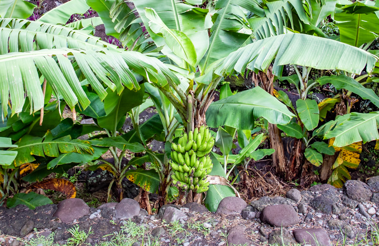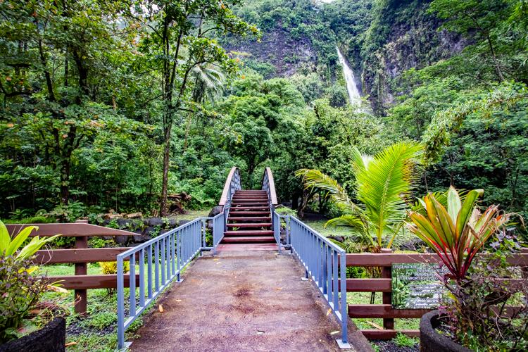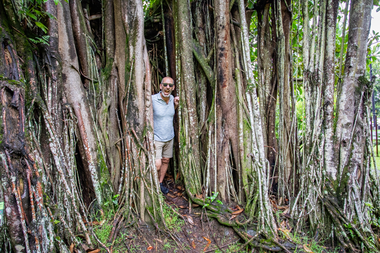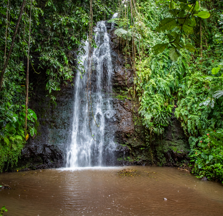 We reach a side road that heads uphill towards the middle of the island. We arrive at a trail to the 3 Waterfalls of the Fa’Aruma’i Valley waterfalls that tower hundreds of feet above us. We are in The Valley of 1000 Waterfalls! The water cascades in such a furious torrent that it leaves a heavy mist in the air that soaks everything including our cameras. I coach Elee to keep her camera pointed at the ground and only pick it up to shoot a fast image before pointing it down again.