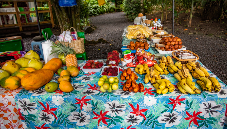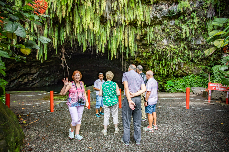 Then it’s off to a botanical garden with 3 Grottos, “Grotte De Mara’a”, “Grotte De Vaipoiri” and “Grotte De Mata Va’a” where our cameras are once again entertained with colorful sights and Fabrice describes the history of the island. In these Cave Grottos, the water that permeates the rock permanently drips in the caves like rain. We make some other stops including a hiking trail around the Botanical Garden. We then hike a short distance to the Vaipahi Waterfall. A small token of waterfalls yet to be seen.