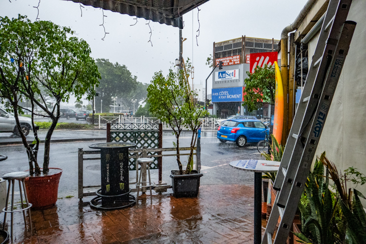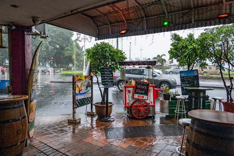 After an hour in the open air bar, we hear a big crash and look up from our computers to see stand up signs outside the restaurant crash to the ground and the wind whips things around violently. My suspicions about the weather are confirmed when, all of a sudden, the rain pours down in sheets as another squall sweeps over the island. Our guide this morning told us this is their rainy season. So we continue our blogging and watch the rain and people in it.