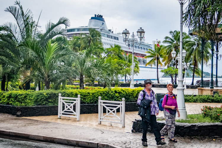 It has stopped raining as we walk into town and the air is comfortable yet humid. By the time we return to the ship it has started raining again and as our luck would have it, it downpours on the last 100 yards to the ship. But we remain mostly dry as we walk up the gangway onto the ship. We deposit our wet outerwear in our room and grab drinks in the pub before retiring for the evening. We have a scheduled tour of the island bright and early at 8 AM.