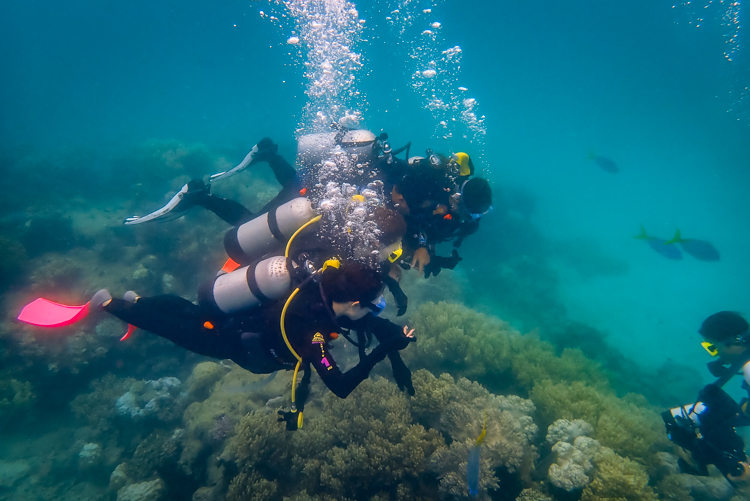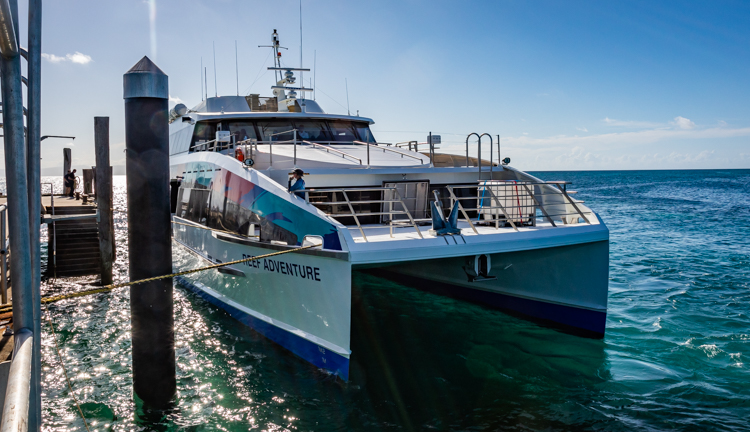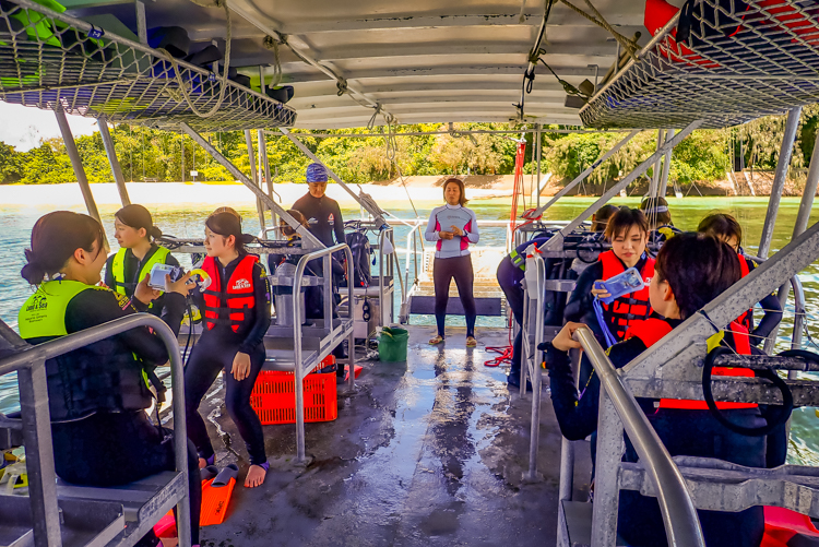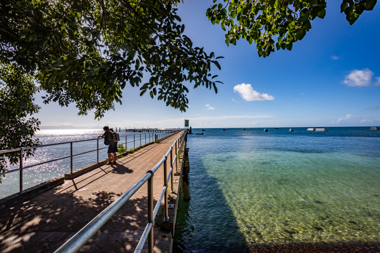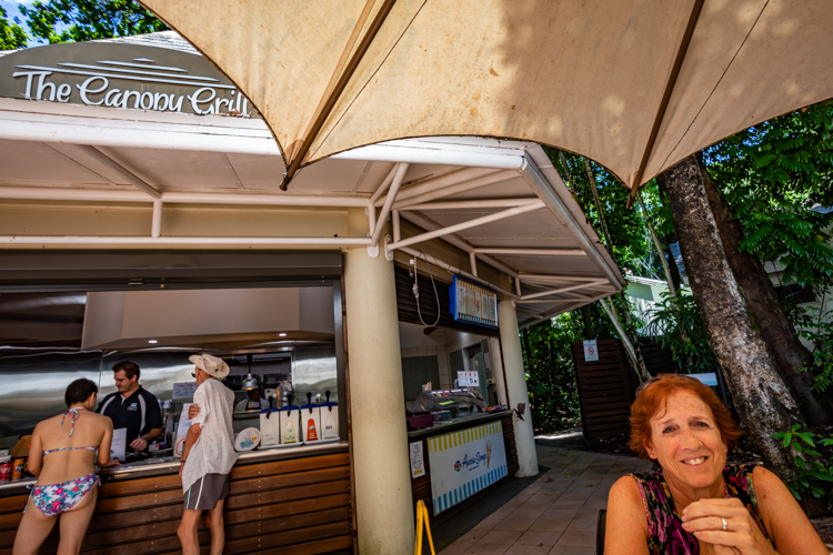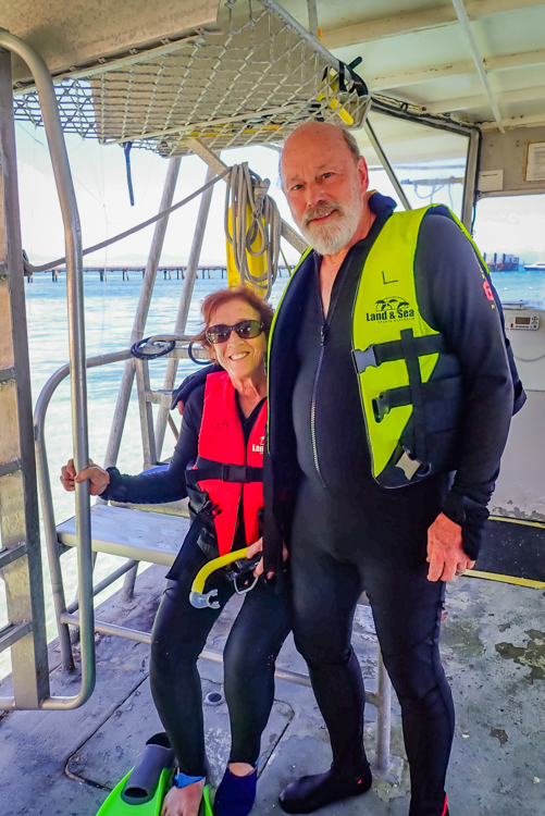 Everybody queues up for the ferry and boards. As we depart from the shores, our cameras capture a few last images and we ride the 45 minutes back. Once we are safely ashore, all we have to do is find a ride back the 30 minutes to Yorkey’s Knob. The last shuttle bus has already left. So I return the rented underwater camera and head to the Info office to inquire about transportation. As our place in the queue (Everyplace has a queue, it seems) get to the front of the line, Elee spots and hails an Uber Driver and he gives us a ride back to the Tender Port.