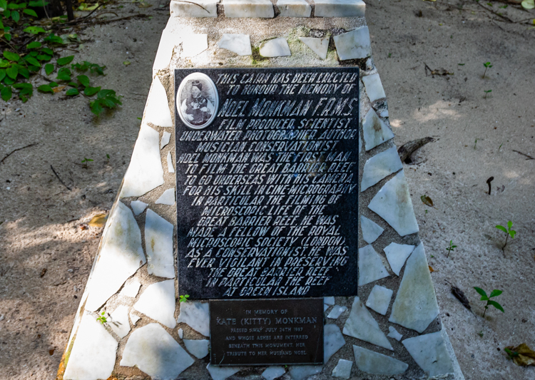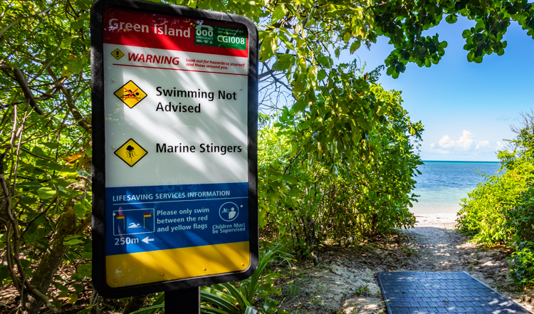 So our arrival at Green Island is much anticipated and a scenic sight also. We walk the dock onto the island and a few steps later (The island can be walked from end to end in about 10 minutes!) we check into the Dive Shop where we rent our Snorkel Gear. This time we actually get fins with our gear, not like Bora Bora with only snorkel and mask. We also opt to rent “Stinger Suits”, lightweight Lycra body suits to protect against the region’s “Box Jellyfish”, a jellyfish the size of our pinky fingernails that reportedly can be deadly! What a charming thought! But we are assured the suit will protect us.